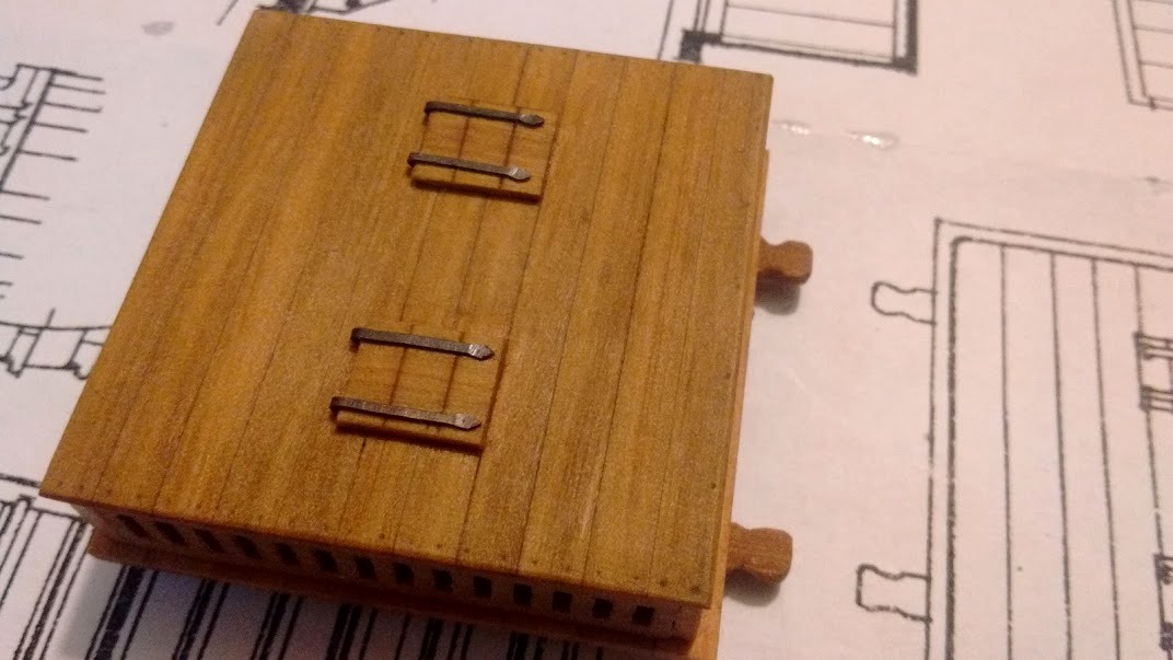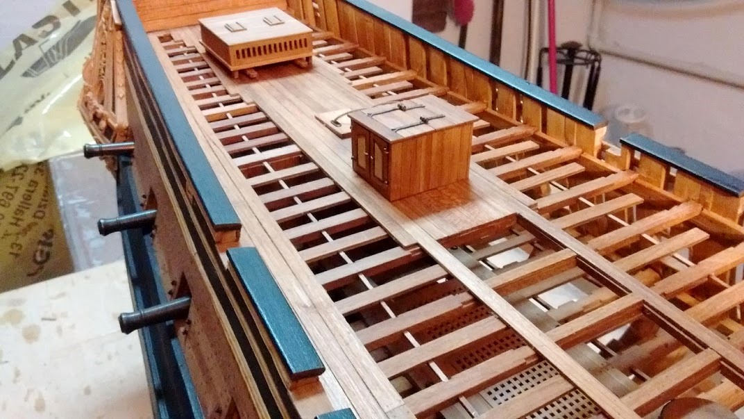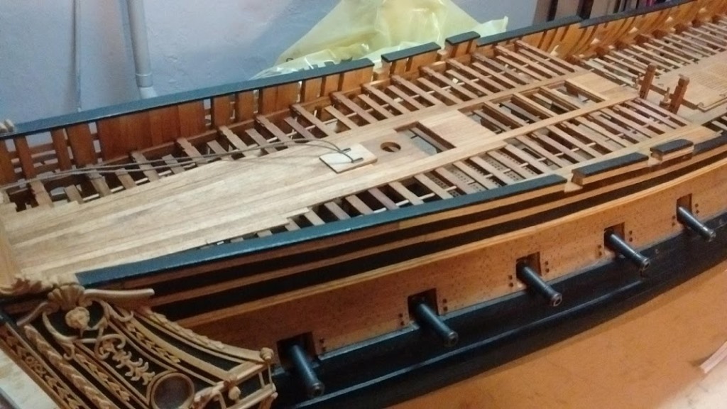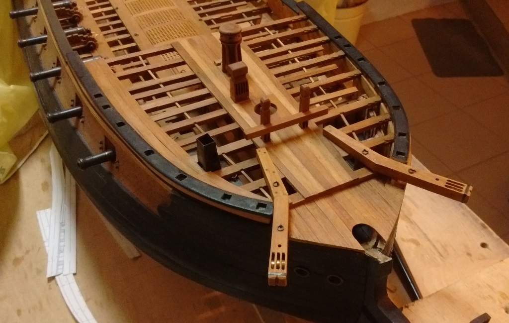 Może tylko dałbyś krótkie odcinki planek pokładowych pod koła lawet, by na nich poustawiać działa - to powinno wystarczyć i dac wystarczający efekt ażurowości, by pod nimi niższe pokłady były jeszcze widoczne.
