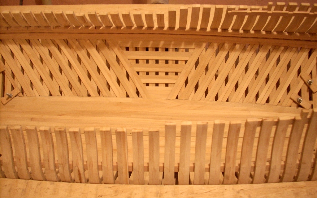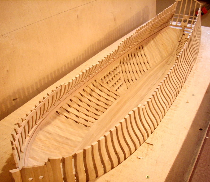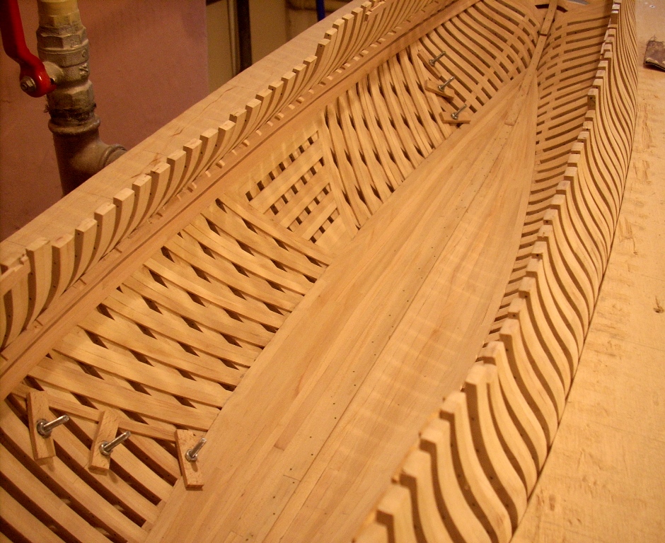 Prace nad poszyciem wewnętrznym trwają . Troszkę to schodzi bo każda deska musi być wygięta i ściśnięta do wręg ze względu na ich kształt i trzeba odczekać aż złapie i wyschnie klej.