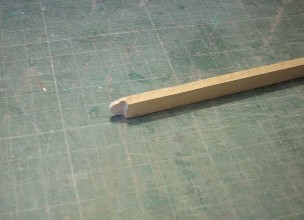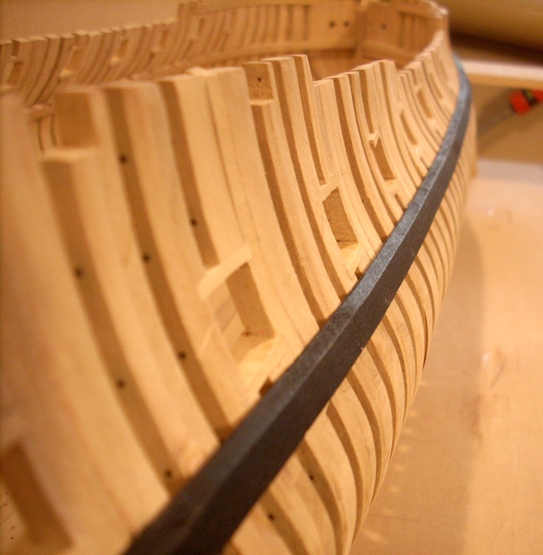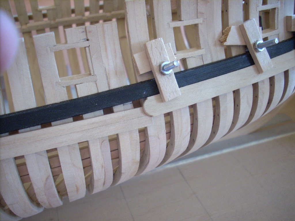 zrobiłem gwoździowanie poszycia wewnętrznego drut miedziany 0,5mm oraz przykleiłem pierwsze listwy poszycia zewnętrznego, jak widać listwa jest cięta po skosie z jednej strony. Kolor czarny uzyskałem barwiąc listwę tuszem kreślarskim ,z jednej strony będzie poszycie na całej burcie natomiast z drugiej tylko listwy odbojowe i dekoracyjne