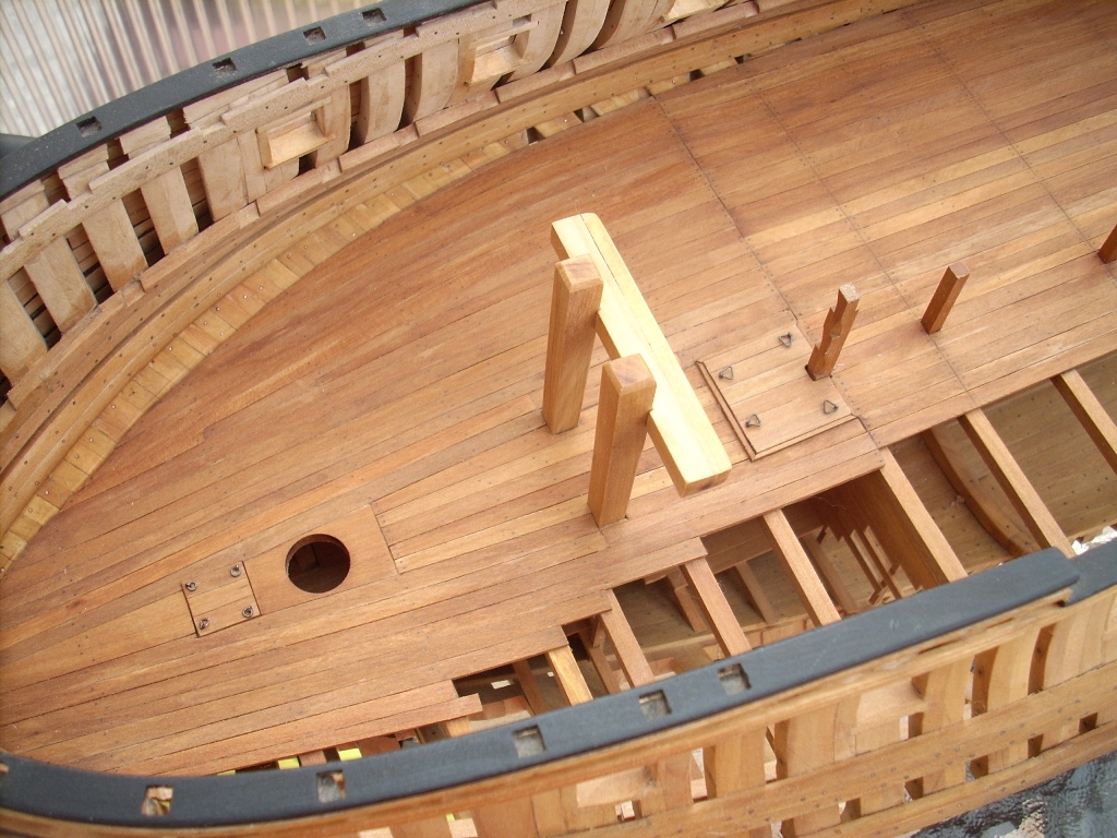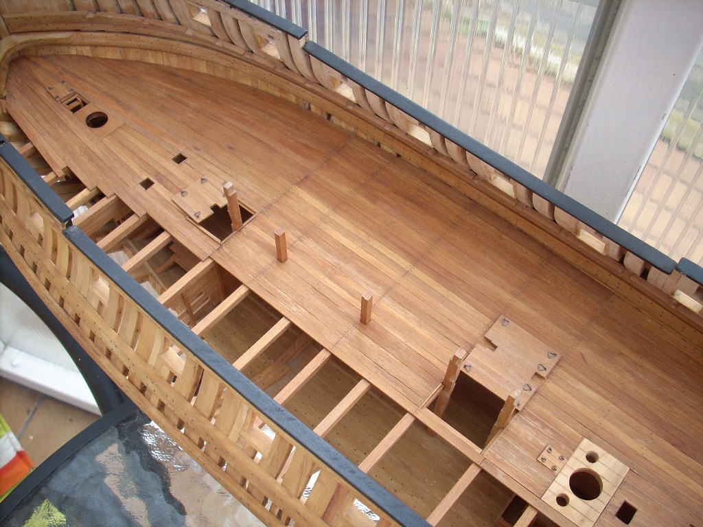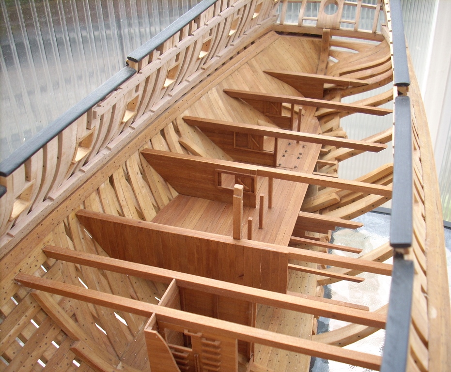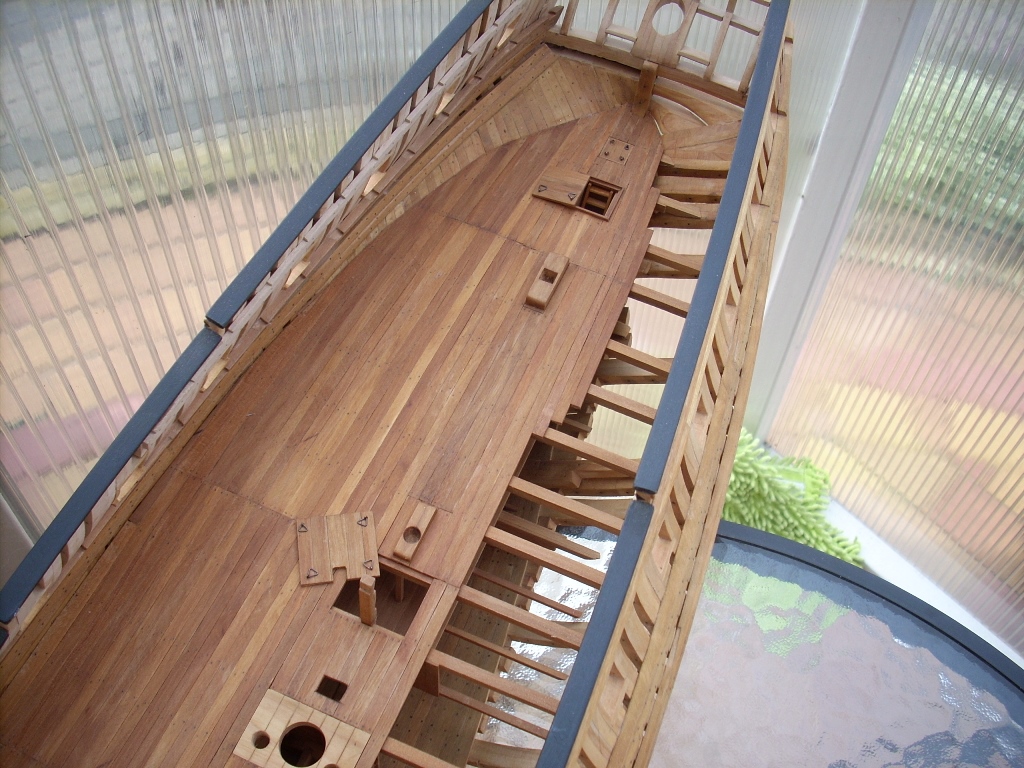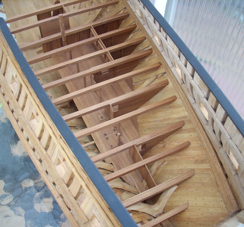 Ja trochę żałuję, że nie porobiłem takich wycięć w jednej burcie, by lepiej uwidocznić wnętrze kadluba w mym modelu i wszystkie tam detale, bo przez szpary między wręgami i przez częsciowo poszyte pokłady widoczność w głąb jest dość ograniczona. A szkoda, bo pracy tam było mnóstwo!