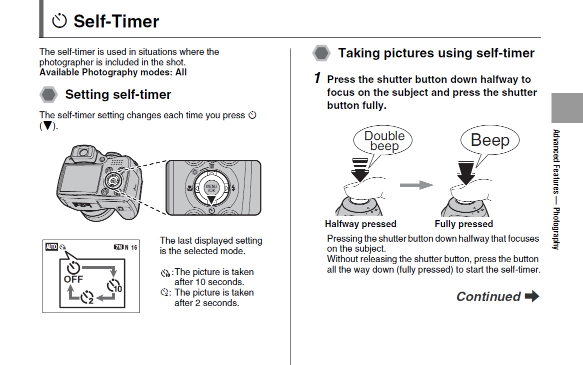 Na zalaczonym skanie masz odpowiednia strone z instrukcji, pokazujaca jak ustawiac ten Samowyzwalacz. Na tylnej sciance aparatu masz tarcze w srodku ktorej jest napis MENU/OK. Nacisnij tam strzalke skierowana ku symbolowi tarczy stopera - ukaze sie ekran, jak na w/w skanie. Naciskajac dalej wybierasz opcje samowyzwalacza albo 2 albo 10 sekund - jest to czas miedzy nacisnieciem spustu a zrobieniem zdjecia. Do zdjec Twego modelu mozesz uzyc czasu 2 sek.