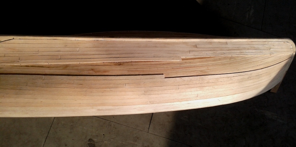 Jako że zapowiadałem iż Grom jest priorytetem więc kolejne fotki i narazie pauza. Poszycie kadłuba gotowe i wstępnie przeszlifowane, teraz czas na sezonowanie. Z doświadczenia wiem że drewno pracuje wiec czekanie na ewentualne pęknięcia i poprawki.