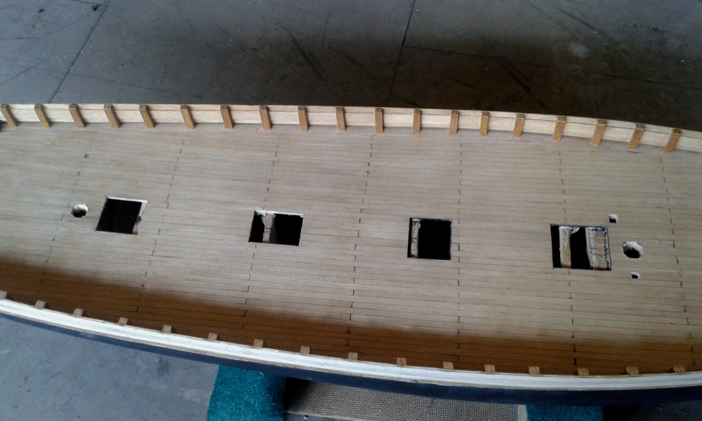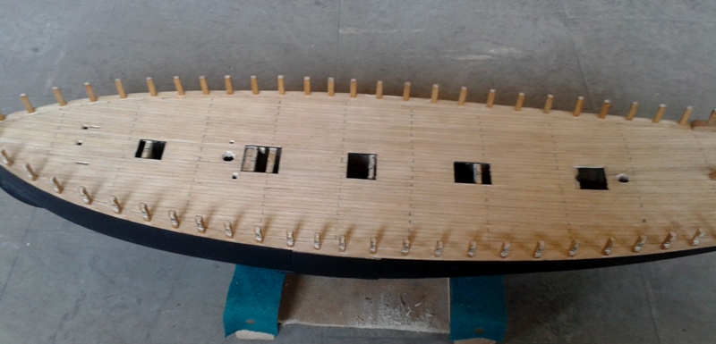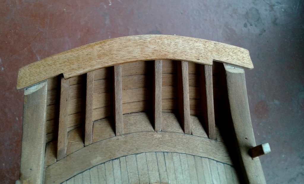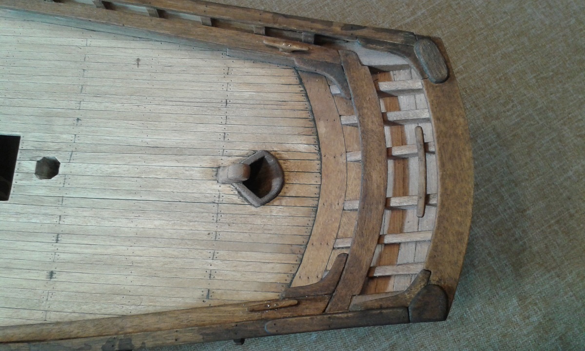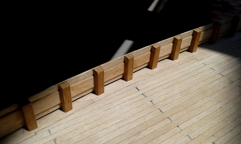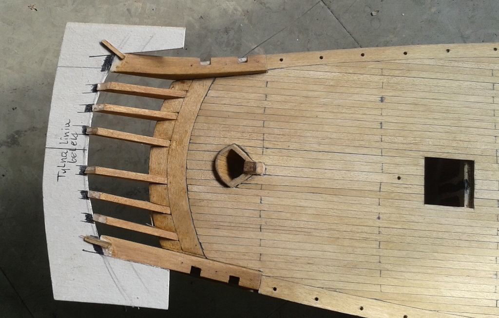 To już pewnikiem ostatnia aktualizacja na następny miesiąc, urlop i kuracja szpitalna. Pomęczyłem się z nadburciami i belką podparapetową. Przy okazji zamontowane pierwsze kołkownice, a na dziobie zamontowany wspornik pod rolkę kotwiczną.