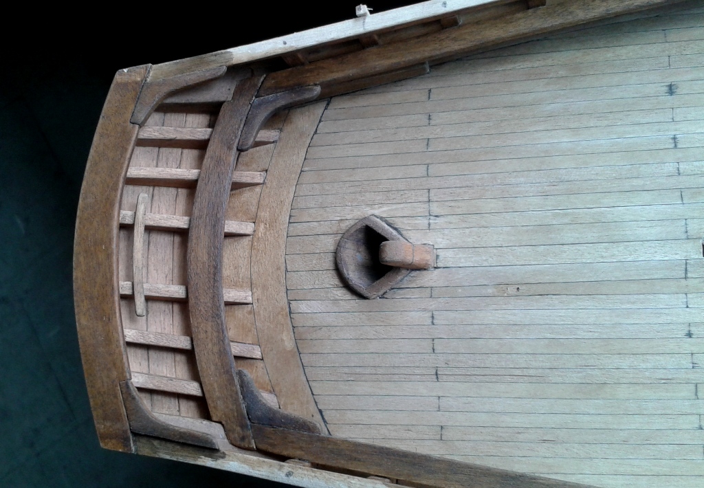 W ramach małego luzu, troszkę prac przy drewniaku. Pokład wycyklinowany i delikatnie pobejcowany jasnym dębem. Wycięte wstępnie otwory w pokładzie pod jakieś luki i świetliki. Zacząłem też składać do kupy całą konstrukcję rufy, no i na kopycie wykonanym z odpadów balsowych poklejona skorupa szalupy.