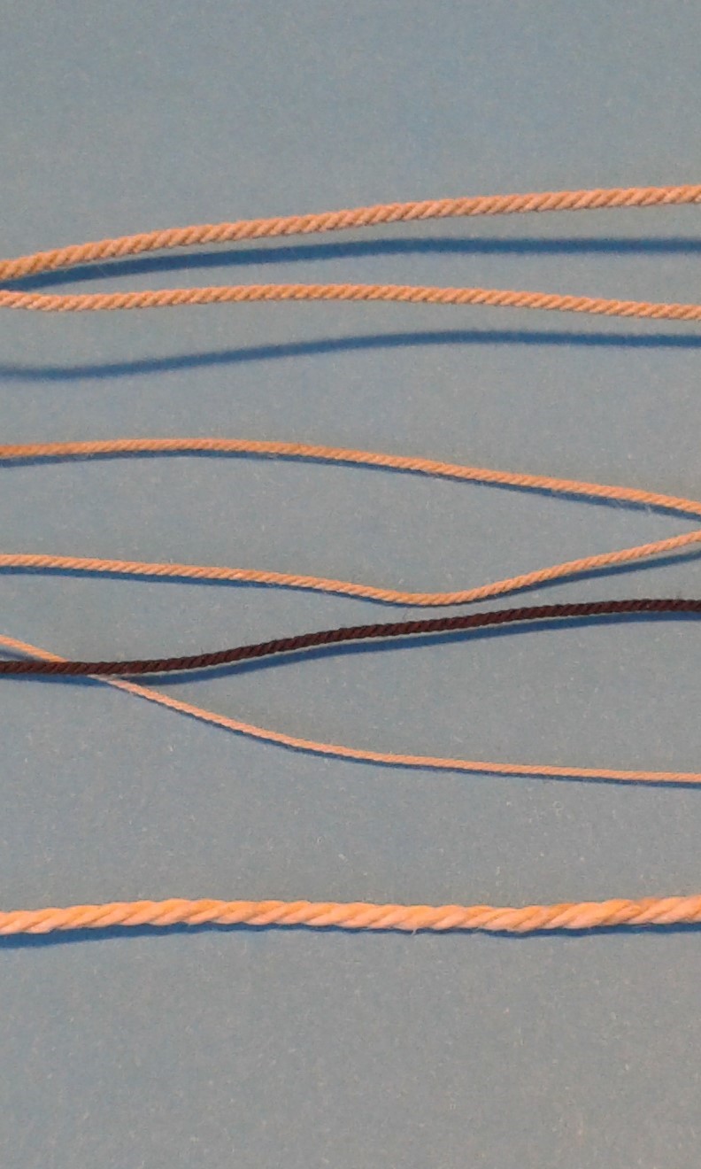 patrząc od dołu:<br />- dratwa biała 3x1,<br />- nić beżowa 120 3x1,<br />- nić brąz 80 3x1,<br />- nić beżowa 120 3x2,<br />- nić przemysłowa 36H 3x1, 3x2 i 3x3