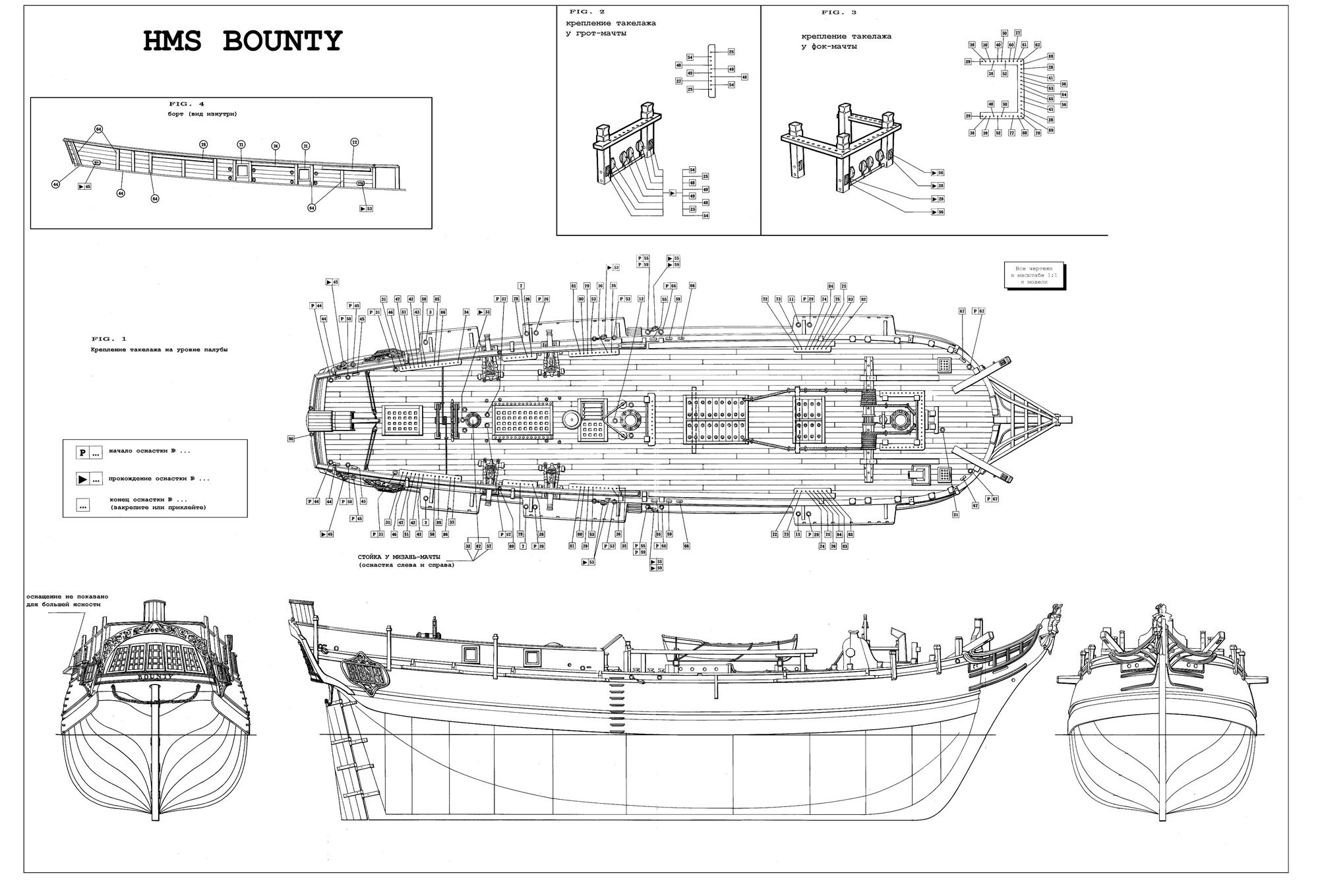 Leon, ja nie buduje Bounty z Anatomy of the Ship - HMS Bounty. Buduje na podstawia planów , na których Bounty wydawał mi się najładniejszy a tam podpory wantowe są u góry i nie będę tego zmieniał. Mam parą planów Bounty i na każdym Bounty wygląda inaczej, ale ja korzystam z rysunków poniżej i tego będę się trzymał.