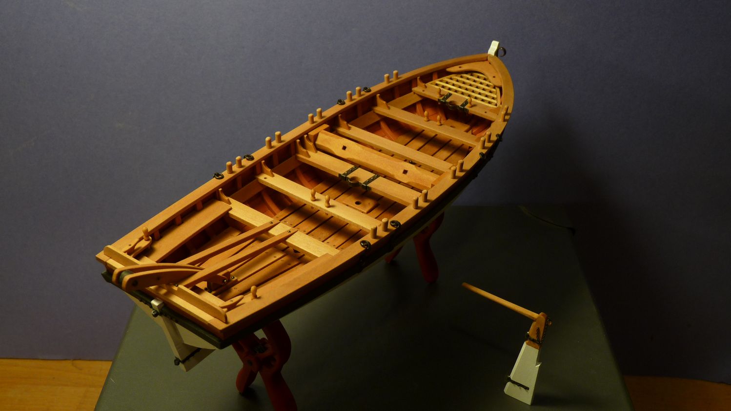 Kolejne elementy to kołki do obracania kabestanu i kołowrotów oraz podstawka pod szalupę.