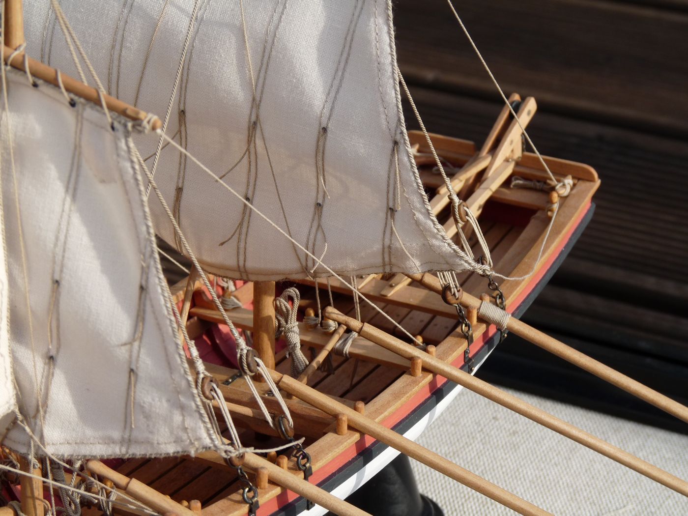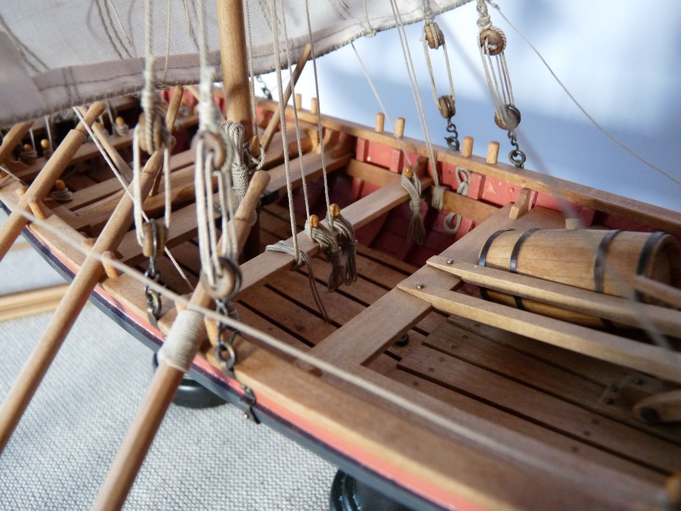 Do przytrzymania rei do masztu użyłem takiego rozwiązania jak widać na zdjęciach ( kausza przymocowana do fału ). Bardzo podobne rozwiązanie było na jednostkach brytyjskich po około 1775 roku.