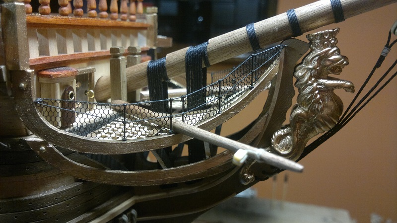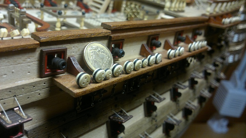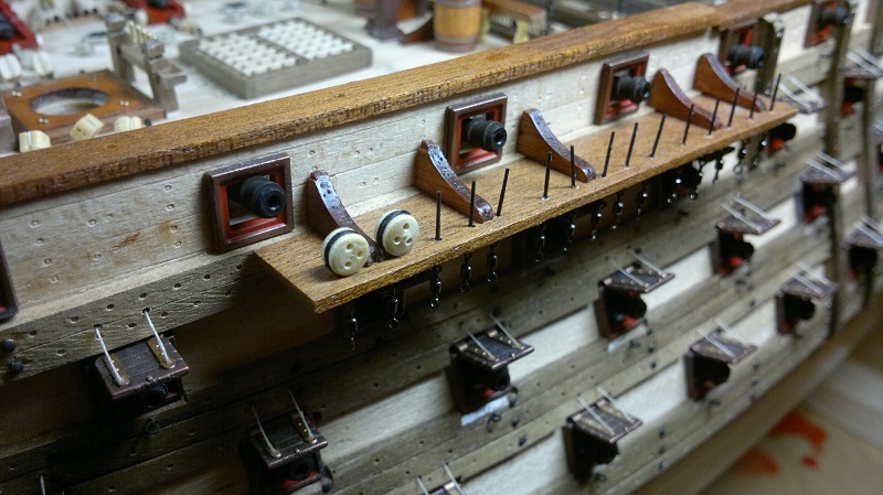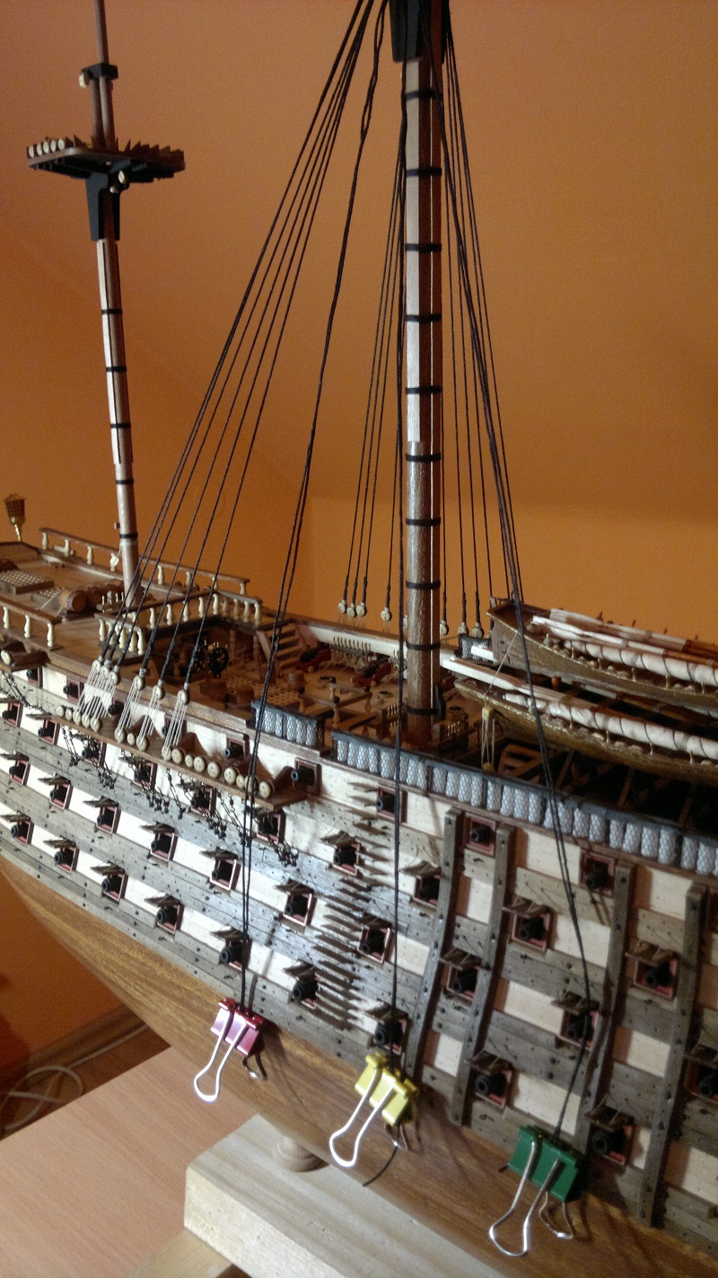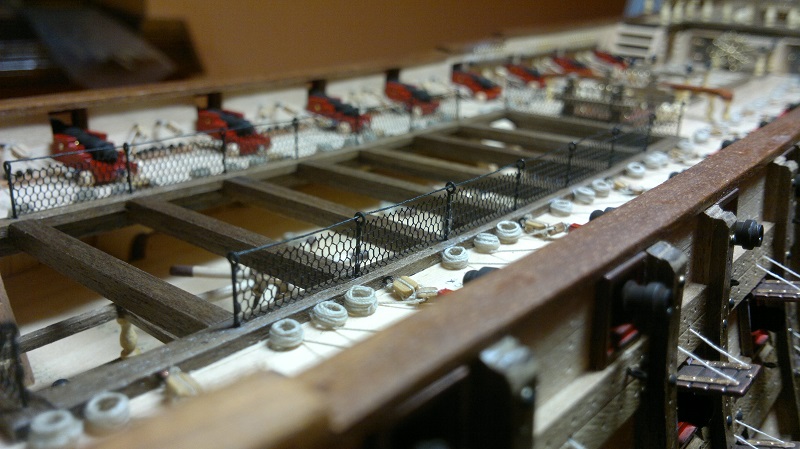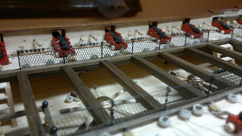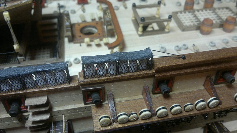 Hmmm... teraz jak to nazwać.. waloryzacja chyba bo inne słowo nie przychodzi na myśl. Jakieś zabezpieczenia by załoga nie powpadała Zastosowałem szpilki z oczkami potraktowane oksydą. Siateczka docięta na wymiar potem do kupy wszystko razem. Dodałem też zwinięte z linek pojemniczki na kule armatnie.
