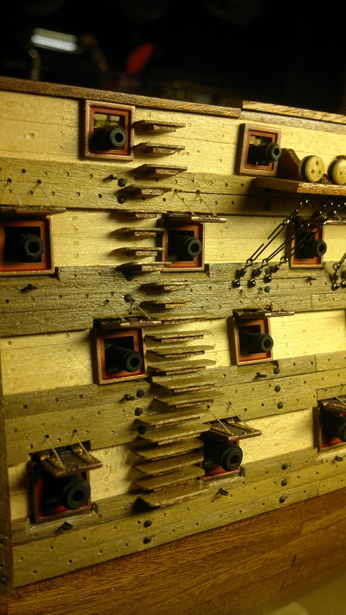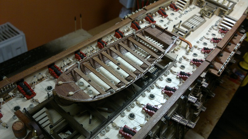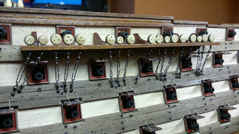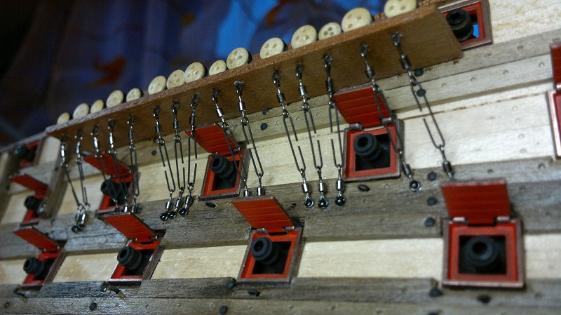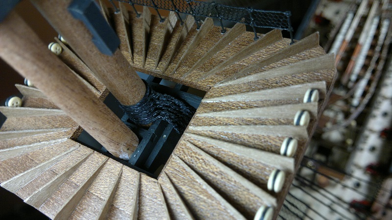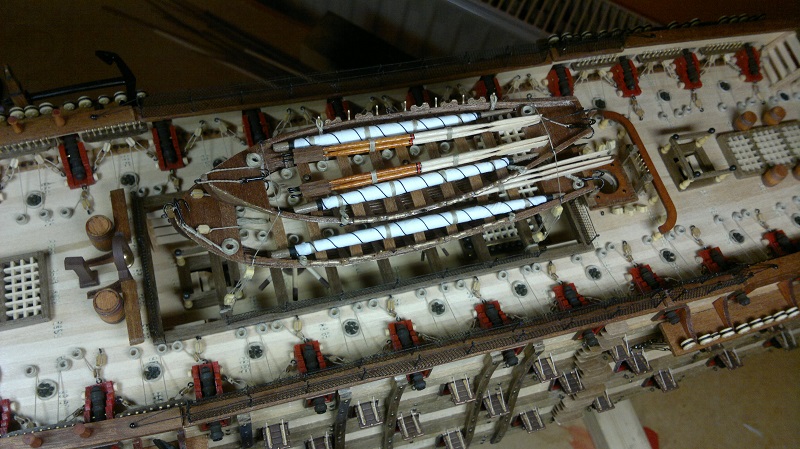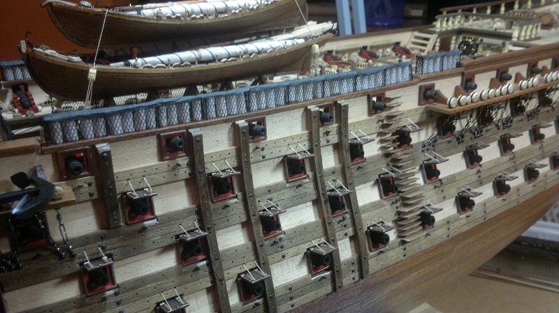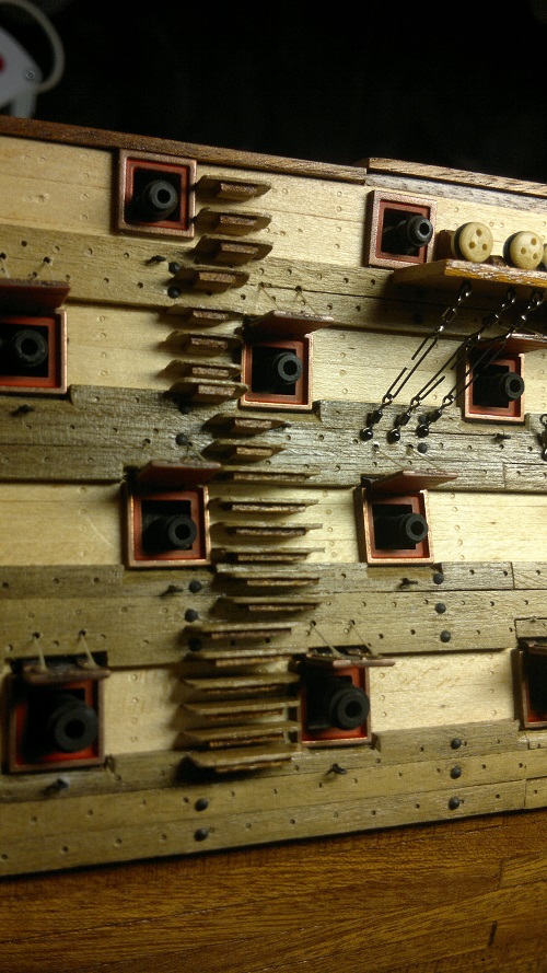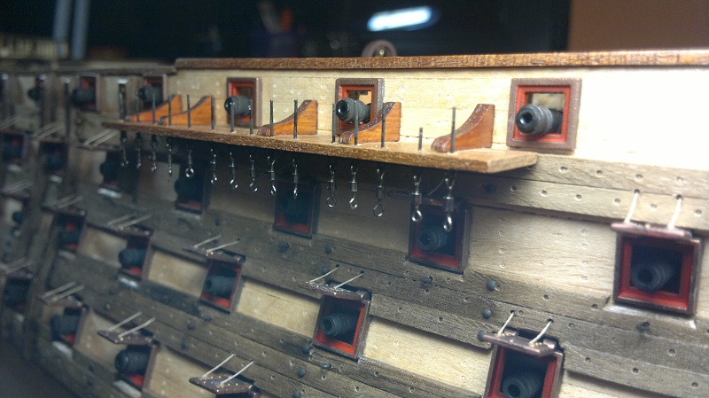 Hmmm... teraz jak to nazwać.. waloryzacja chyba bo inne słowo nie przychodzi na myśl. Jakieś zabezpieczenia by załoga nie powpadała Zastosowałem szpilki z oczkami potraktowane oksydą. Siateczka docięta na wymiar potem do kupy wszystko razem. Dodałem też zwinięte z linek pojemniczki na kule armatnie.