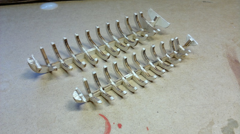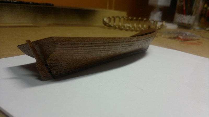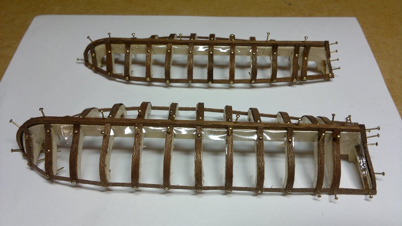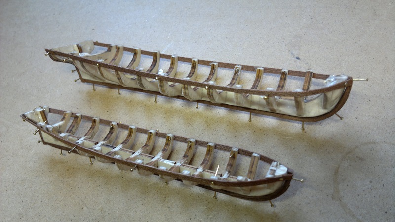SZALUPY ! Tu od razu się przyznam że miałem dylemat jak te małe łódeczki wykonać. Forum i inne strony przewertowane i pytanie.. Czy robić jak w instrukcji czy coś więcej od siebie wymagać. Raz się żyje haha Wspomnę że wzorowałem się na waszych relacjach. Tylko że ja to troszeczkę inaczej zrobiłem. A więc na sam początek szkielet szalupy. Następnie taśma samoprzylepna w celu oklejenia żebrowania. Tu już wykorzystałem listewki fornirowe które przecinałem na pół i pokrywałem na zakładkę. (Listewka 4mm dzielona na 2mm a sama zakładka około 1mm )Przed każdym gwoździkiem wierciłem wiertełkiem 0.6mm. A to po to by listewki fornirowe nie pękały. Potem delikatnie na gwoździkach z małym użyciem kleju (pattex). Największe obawy były przy wyciąganiu szkieletu. Naprawdę delikatnie podważając separacja okazała się dla mnie szczęśliwa. Potem kosmetyka szlifowanie lakierek itd.
