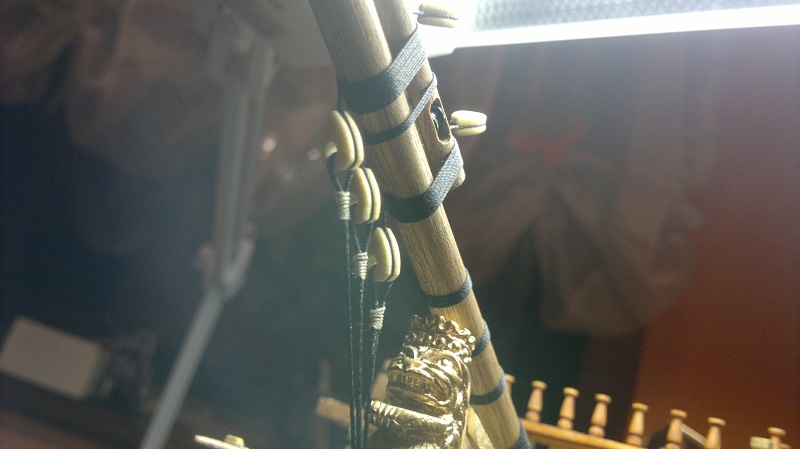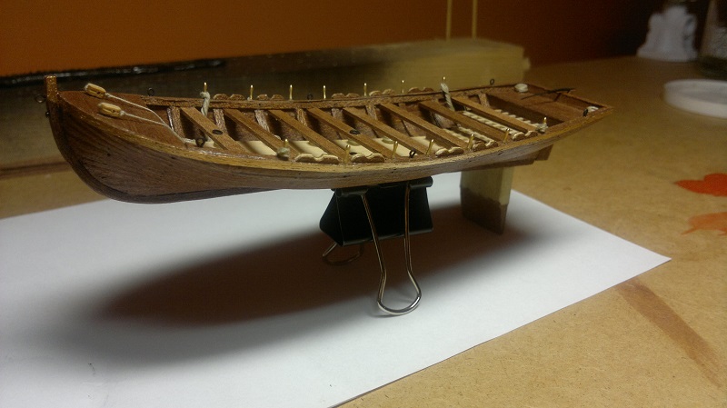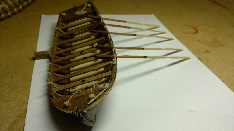 Szalupkę wykańczałem według własnego pomysłu. Te listeweczki dały w kość. Na sam koniec postanowiłem stworzyć wiosła. Po 3 pary wystarczy. Na zdjęciach przymiarka Łajby