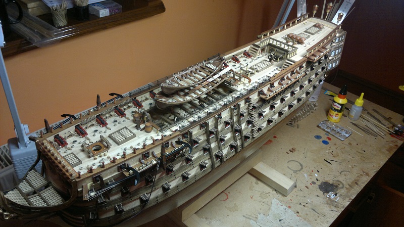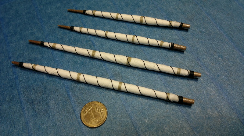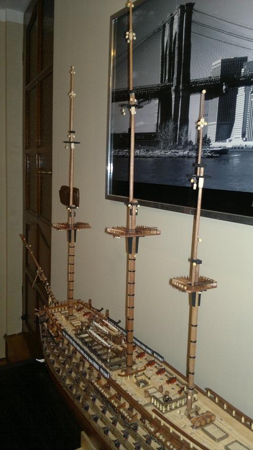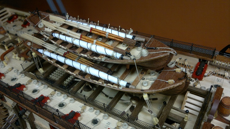 Analogicznie wykonałem mniejszą szalupę Z nudów zrobiłem maszty z nawiniętymi żaglami. (Żagle brudziłem w późniejszym czasie) Całość zamontowanie na okręcie przy pomocy drewnianych tralek 20mm, które troszkę skróciłem. Całość wzmocniona podporami by szalupy stabilnie siedziały.