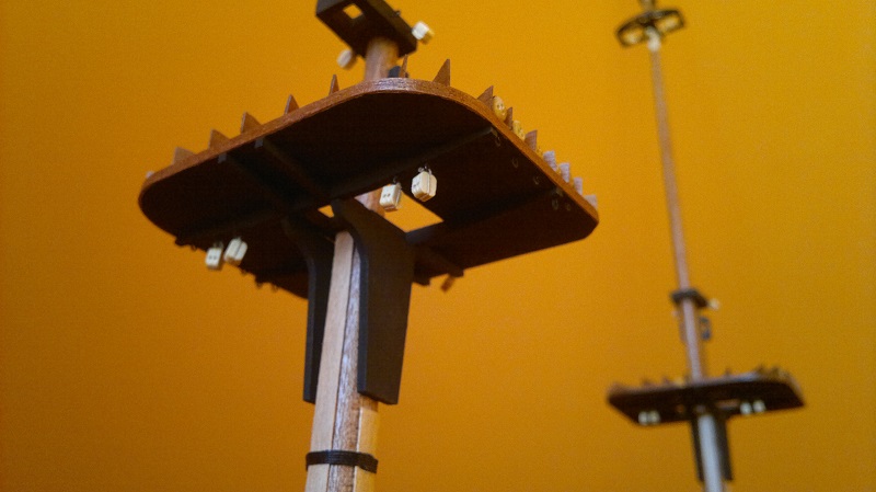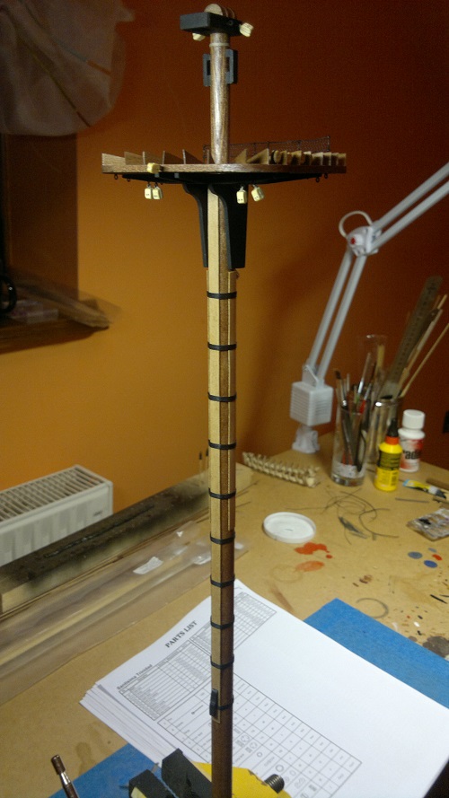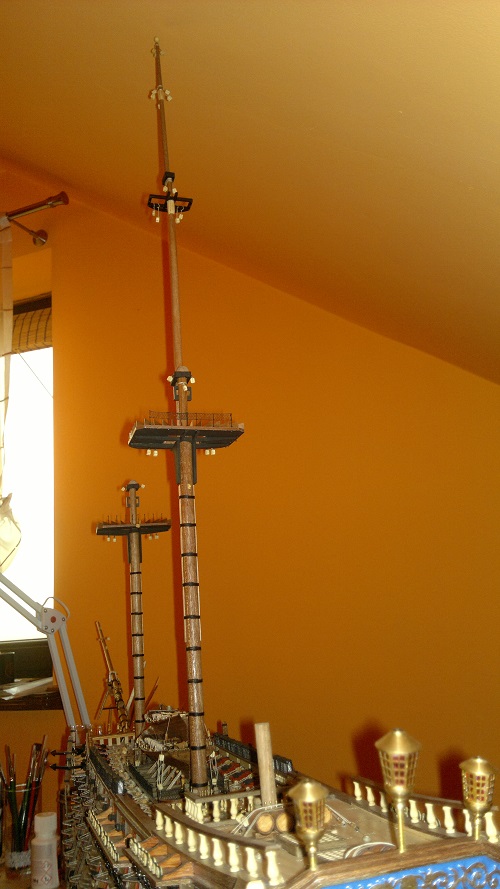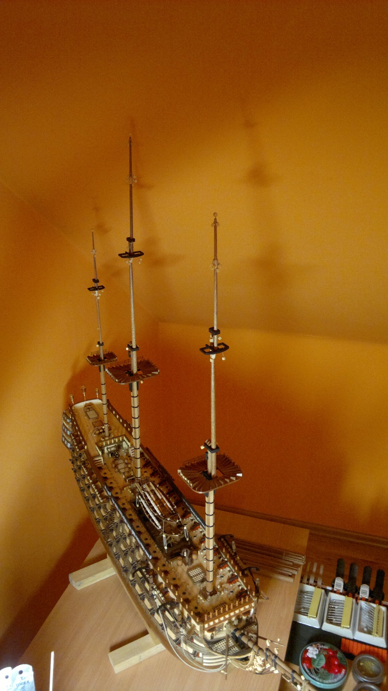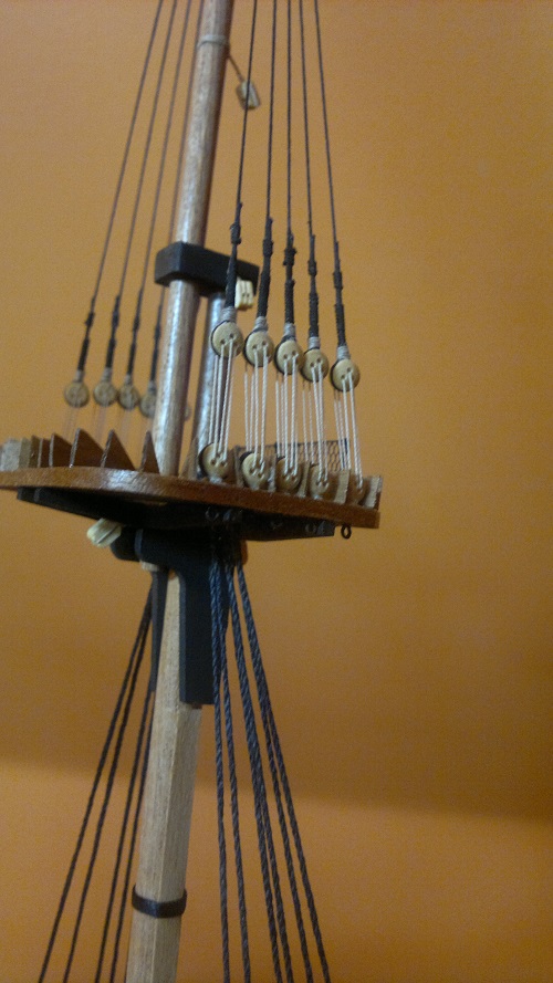 Cześć dziś czas na maszty. Opieram się na planach dołączonych do zestawu. Ta sama technika jak przy bukszprycie wiertareczka papier ścierny itd. Co do platform to te gotowe z ramek postanowiłem pokryć listewkami forniru. Następnie szlifowanie. Teraz moi mili muszę przyznać się do błędu. Chodzi o te trójkąciki na platformach. Kiedy podszkoliłem się w tym zagadnieniu teraz już wiem co i jak. Załączam zdjęcie jak to powinno wyglądać. Niestety człowiek na błędach się uczy a żeby to poprawić to już troszkę było za późno. Następnym razem na pewno będę o tym pamiętać. Dodano też bloczki jufersy owijki na trzpieniach listwy fornirowe z gruszy itd itd. Przesyłam kilka zdjęć bo akurat na tym etapie nie zrobiłem ich za wiele