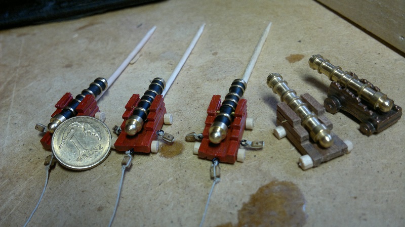 lawet również, ale jeżeli nie miałeś wzorca to kształt „burt” trzeba było odwzorować z odlewu, również osadzenie luf na lawetach jest błędne – trzpienie luf powinny być w metalowych okuciach, a nie w otworach w bokach lawety (przez to lufy są za nisko i leżą na dolnej części ambrazury, bez możliwości manewru – uniesienia do centralnego punktu, analogicznie jak atrapy na niższych pokładach).
