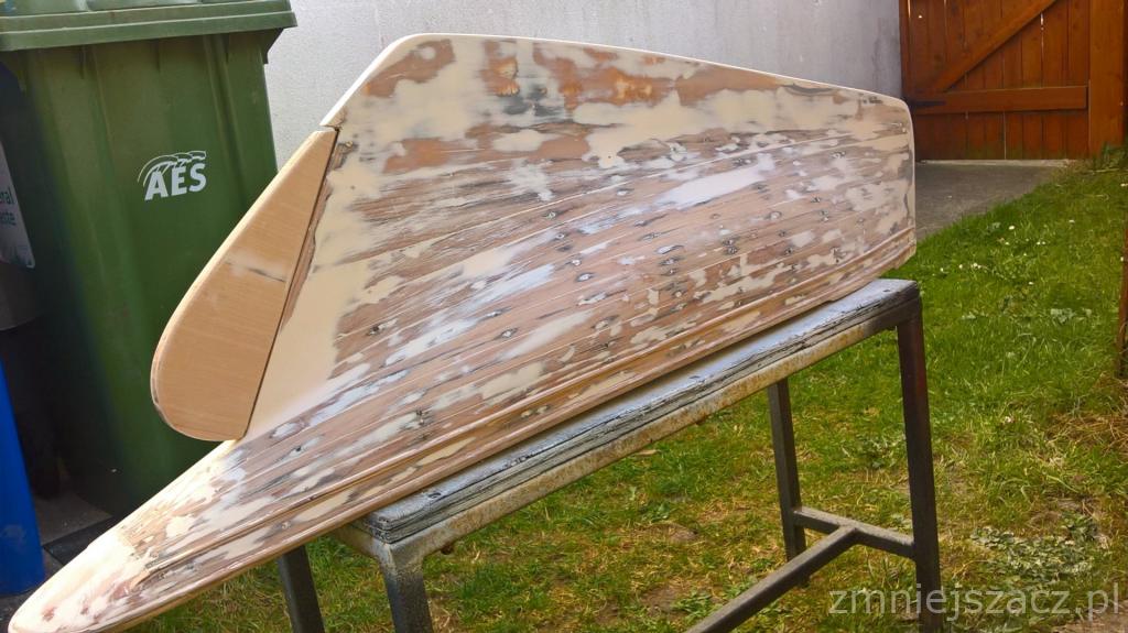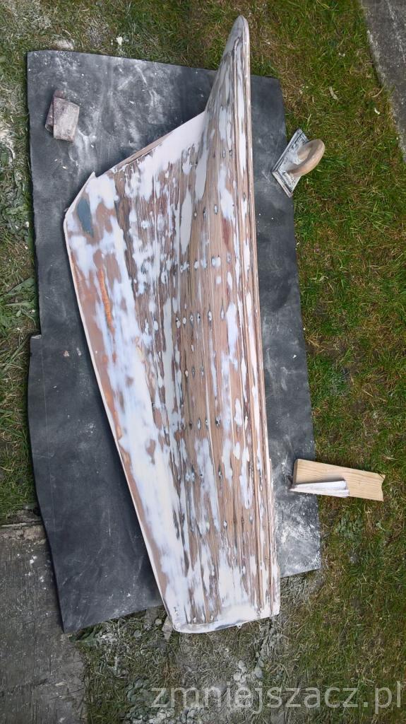 Sie robi. Bryla dosyc okazala (stolik ma 850mm). Bryla bo poza tym nima nic. Maszt do wyrzucenia, bukszpryt tez, steru niema. Cholernie ciezki ale to przez sztabe metalu na dnie kadluba. Bede musial ja usunac bo wodowany juz napewno nie bedzie. O ile wogole cos bedzie...