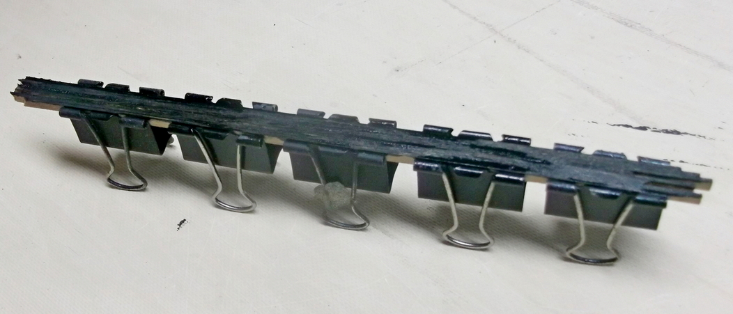 Reszta pokładu z cieńszych klepek. Powiercone otwory 0,8mm i wklejone brzozowe wykałaczki: