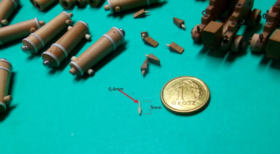 Przed wklejeniem górnego pokładu, musiałem postarać się o solidne przytwierdzenie lawet do pokładu głównego. Stąd gwoździe w lawetach i dzielone lufy: