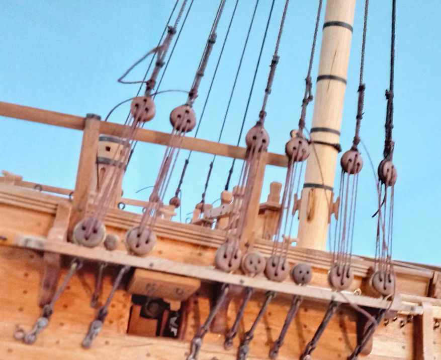 .Z olchy wytoczyłem kolumny masztów, wszystkie inne detale z gruszy:Platforma grotmarsa niemal gotowa:Zgodnie z sugestią Marlena i przy jego pomocy, wykonałem drugą ławkę pokładową, tym razem z ażurowym oparciem, zawiasami i skrzynią pod siedziskiem:Bukszpryt też gotowy i zamontowany w kadłubie:Jufersy talrepowe i kalpy zainstalowane: