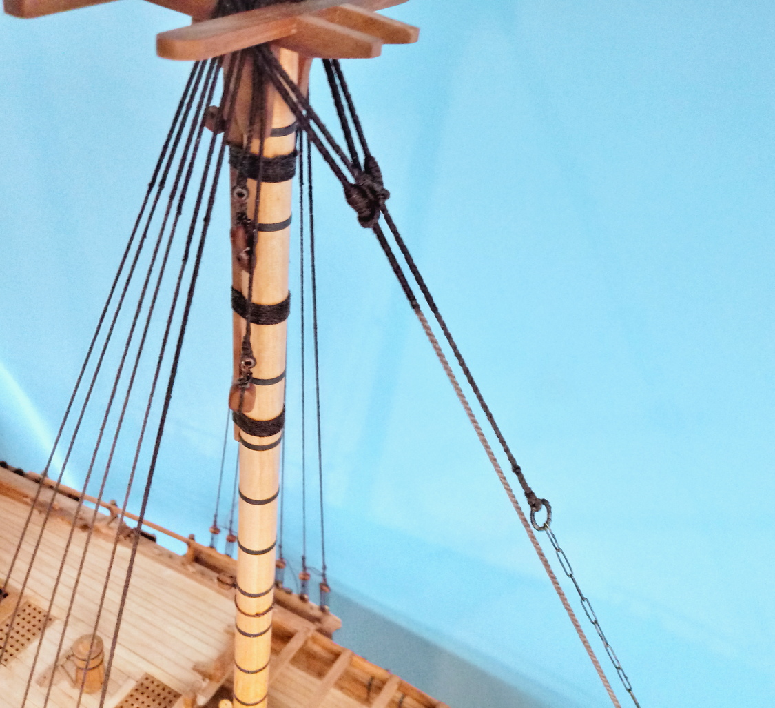 Stengi i topstengi gotowe:A kolumna grotmasztu zamontowana:Nadmiary linek jeszcze nie obcięte, być może potrzebna będzie drobna regulacja naciągu want. To się okaże po montażu katarpin i podwantek.