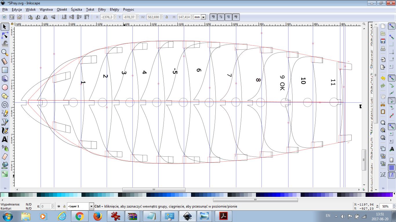 No to lecę póki jestem rozgrzany po Żółtym Lwie . Dwa dni wyrysowywałem wręgi w Inkspace ( plus ze program freeware do wektorówek o możliwościach komercyjnych kolubryn - da się polubić bo jest intuicyjny i ładnie się słucha ). Tak czy inaczej postanowiłem tak jak i Kagra ( za wczesniejszą omyłkę przepraszam ) wszystko umocować na wałku 16 mm i stępce. Problem pojawił się w momencie jak zacząłem się bawić przykładnicami sprawdzając jak wyrysowane z rzutów płaskich wręg korespondują z rzutem bocznymi. Niestety wysokości poszczególnych wręg nijak nie korespondowały ) Szczególnie od połowy w kierunku dziobu. Z kolei tył wszystko ok. Wiadomo, że co za tym idzie trzeba było poprzerabiać wysokości pokładów. Strzałkę ugięcia pokładu wziąłem z nadbudówek. Leciałem z planów rosyjskich i czeskich. Rzut wręg w dostępnej książce Alone around the World J.S. są w ogóle do niczego bo spłaszczone i poglądowe. Nie wiem jak z wyznaczeniem tej skośnej płaszczyzny rufy. Mam nadzieje, że jakoś wynikowo mi to wyjdzie. Przy skali 1:12 kil wychodzi 9 mm gruby. Wręgi sklejka 6 mm. Pokład fałszywy do położenia finalnego forniru przewidziałem 3 mm . Usztywni mi to całość do szlifu. Cały będzie miał 92 cm. Niby prosty projekt ale zobaczymy