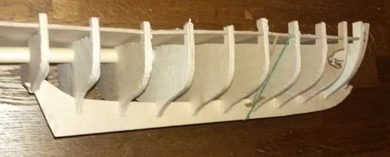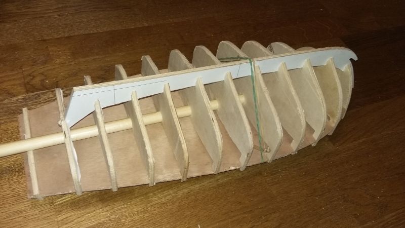 Pokład przypasował na strzał idealnie i przylega do każdej z wręg. Trochę przesadziłem z grubością ponieważ dogięcie będzie wymagać trochę zachodu ale strzałka ugięcia na rufie która jest zarazem górą tylnej skośnej wręgi wyszła igła. Oczywiście bez poprawek się nie obyło. Wręgę nr 0 będzie trzeba powiększyć po obwodzie o szerokość jej grubości. Ostatnią wręgę trzeba było podnieść o 3 mm bo się walnąłem w rysowaniu. Do stępki muszę jeszcze dokleić 1,5 mm do grubości i można już sklejać wszystko razem. Tak więc ogólnie jestem zadowolony Wymiar tego co poskładane 60 cm (długości bez dziobnicy bo dojdzie później) i 23 cm szerokości pokładu. Kawał balii wyjdzie