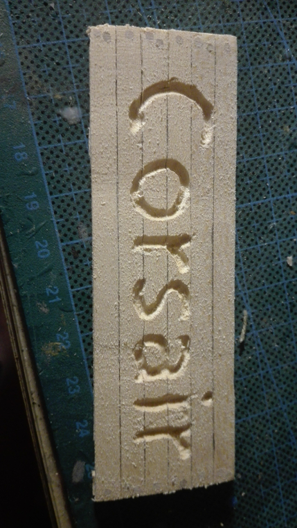 W wolnej chwili wygrawerowałem nazwe modelu, zrobiłem to na imitacji pokładu, literki pomaluje na czarno, a deski pociągne tym samym kolorem co podstawka.