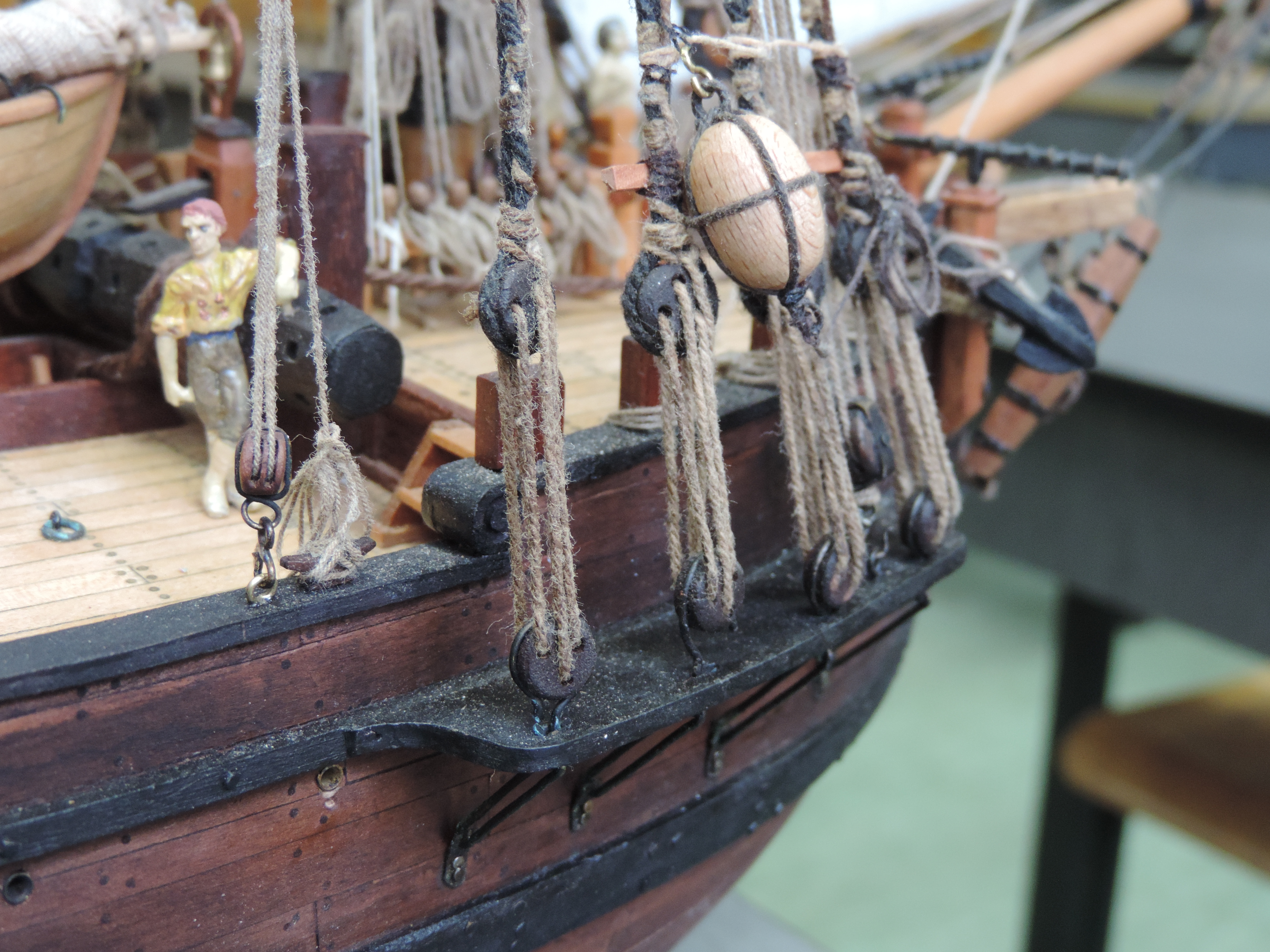 Zakupiłem figurki marynarzy. Wstawiłem trzech załogantów po żmudnym malowaniu , da to efekt porównawczy co do wielkości statku.