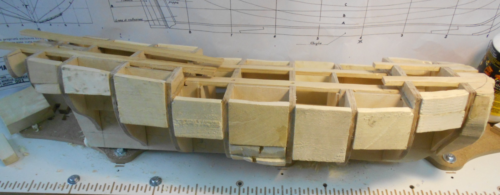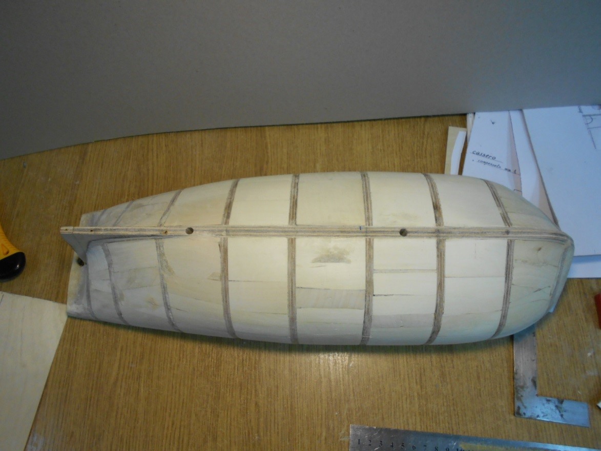 Wewnętrzne pokłady i ścianki w końcu zrobiłem. zacząłem powoli obklejać kadłub drewnem brzozowym.