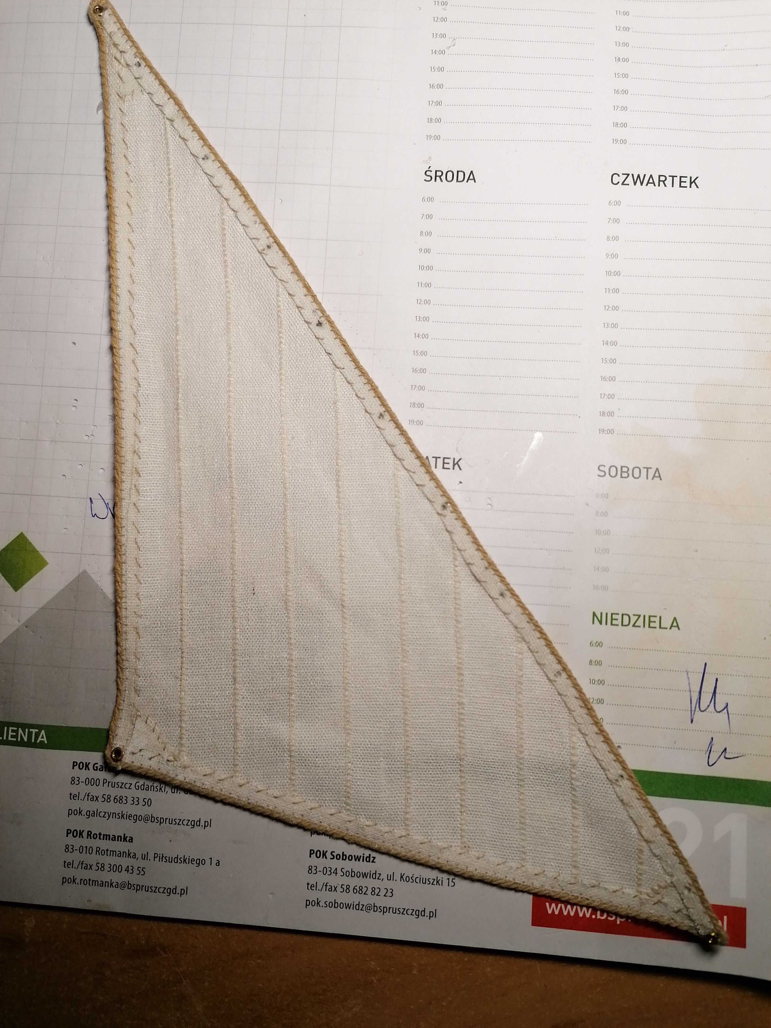 Pozostało jeszcze do zrobienia oczka na rogach fałowych i szotowych. Te postanowiłem zrobić z oczek mosiężnych nitowanych do rogu żagla zgodnie z projektem.