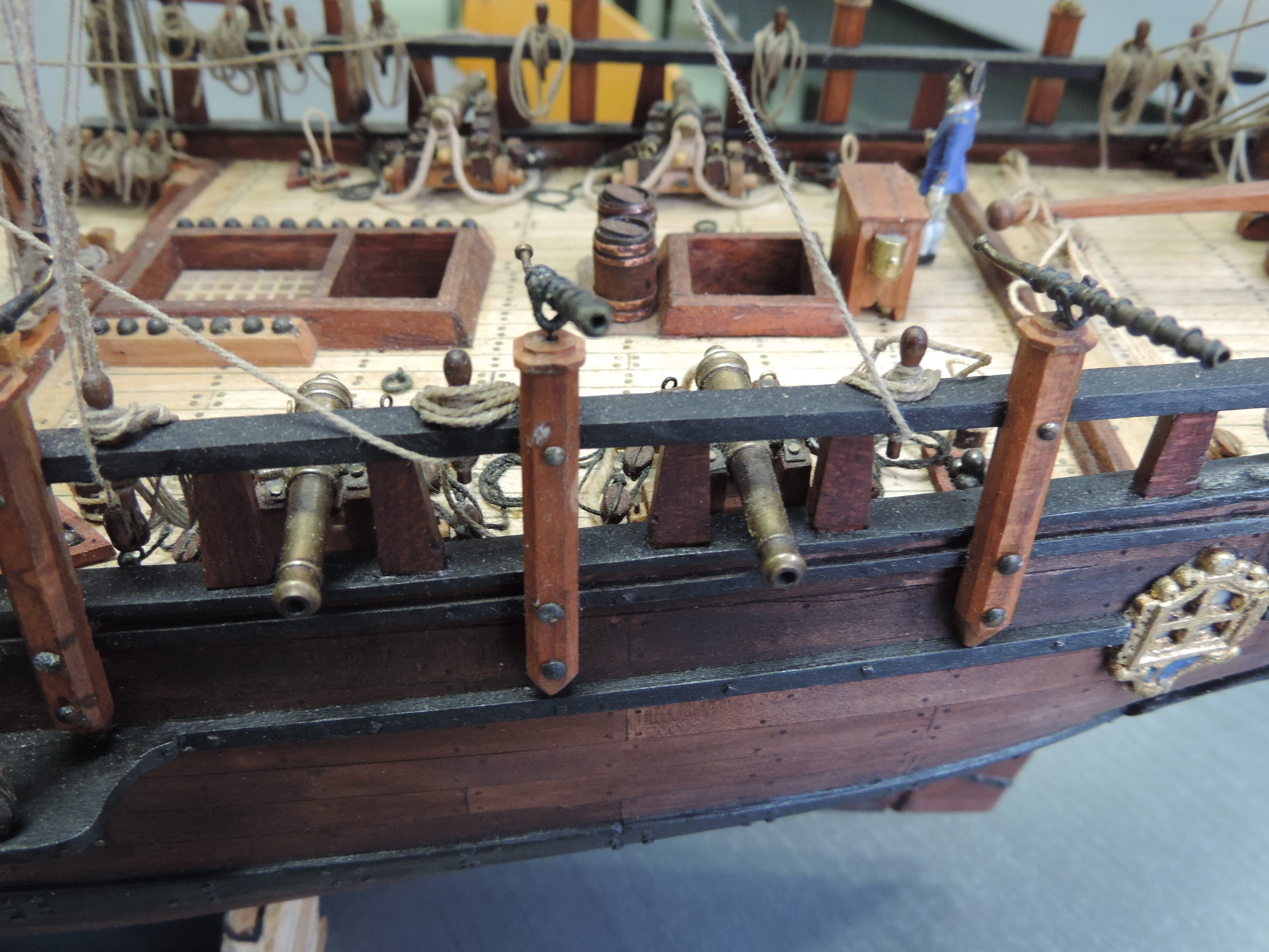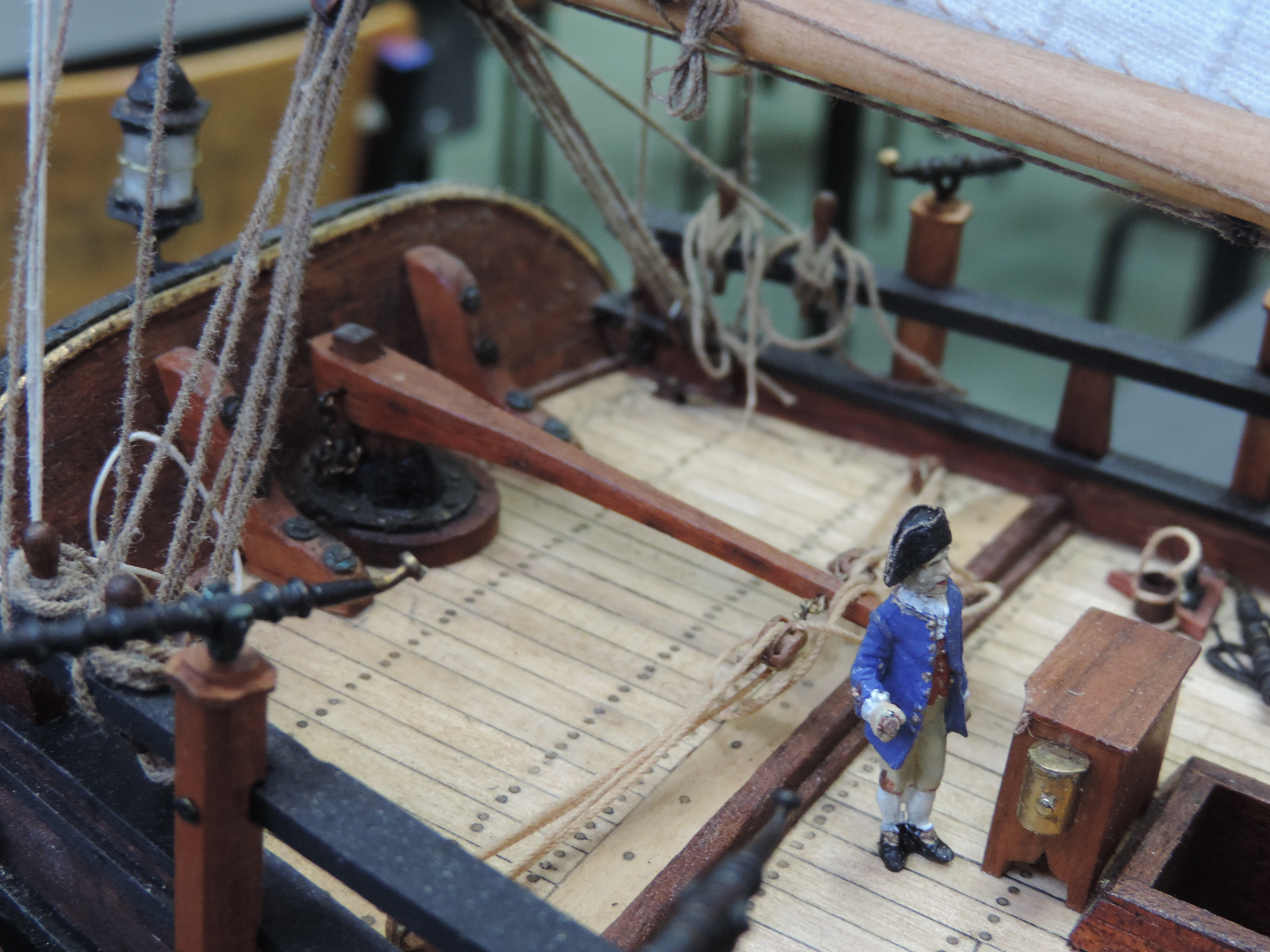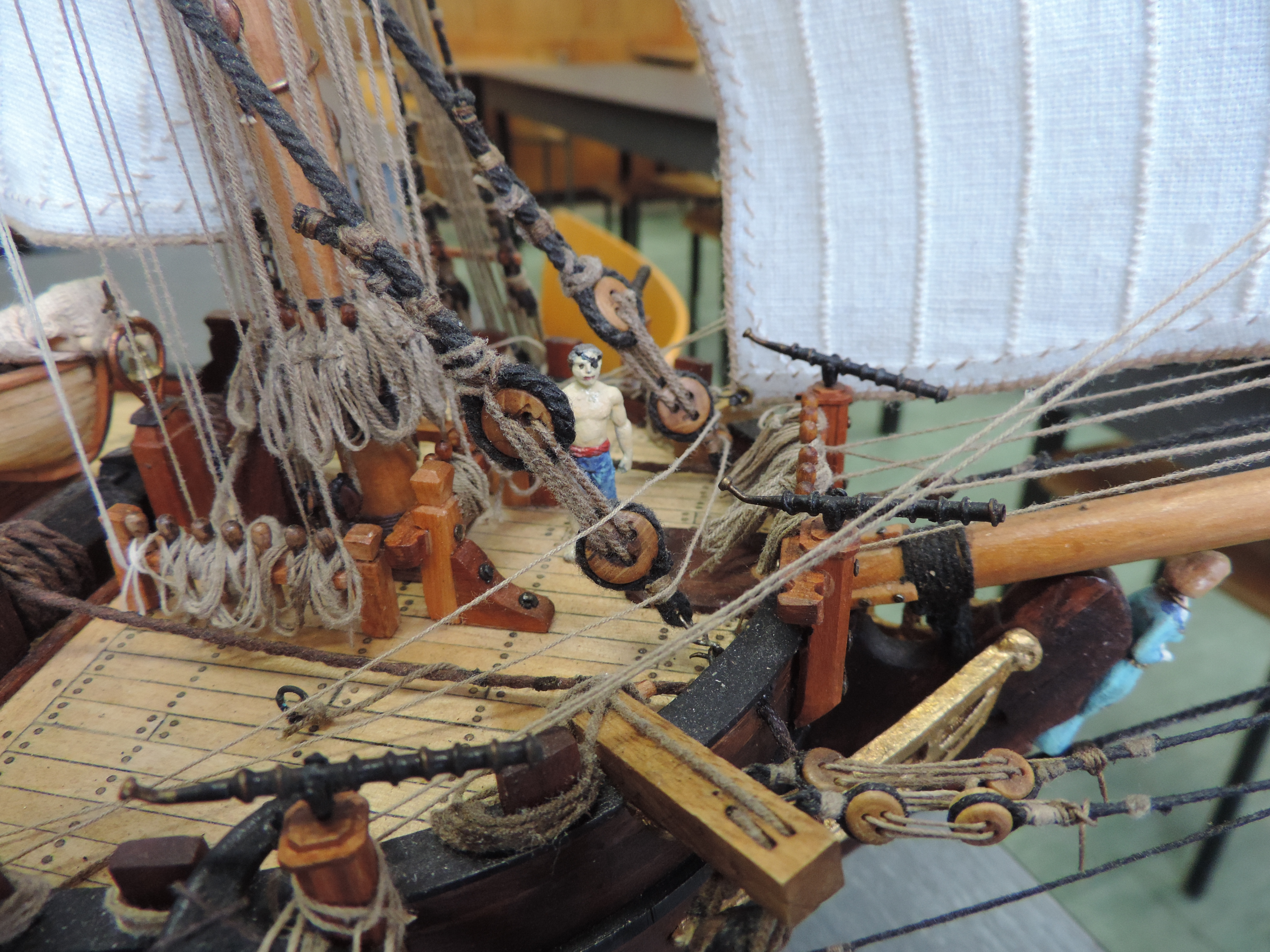 Zakupiłem figurki marynarzy. Wstawiłem trzech załogantów po żmudnym malowaniu , da to efekt porównawczy co do wielkości statku.