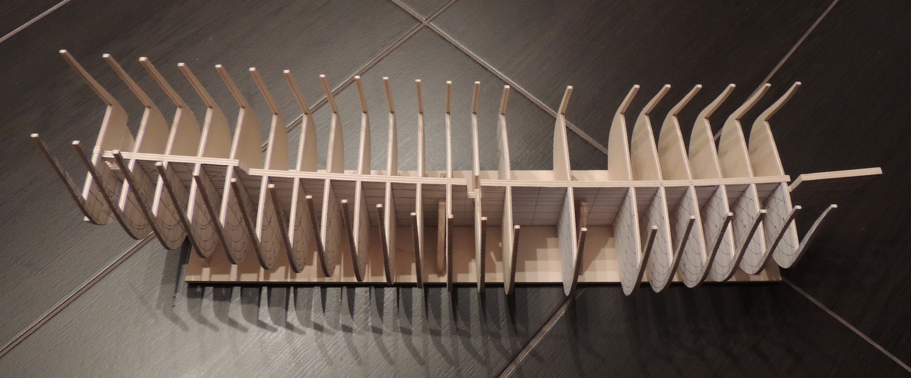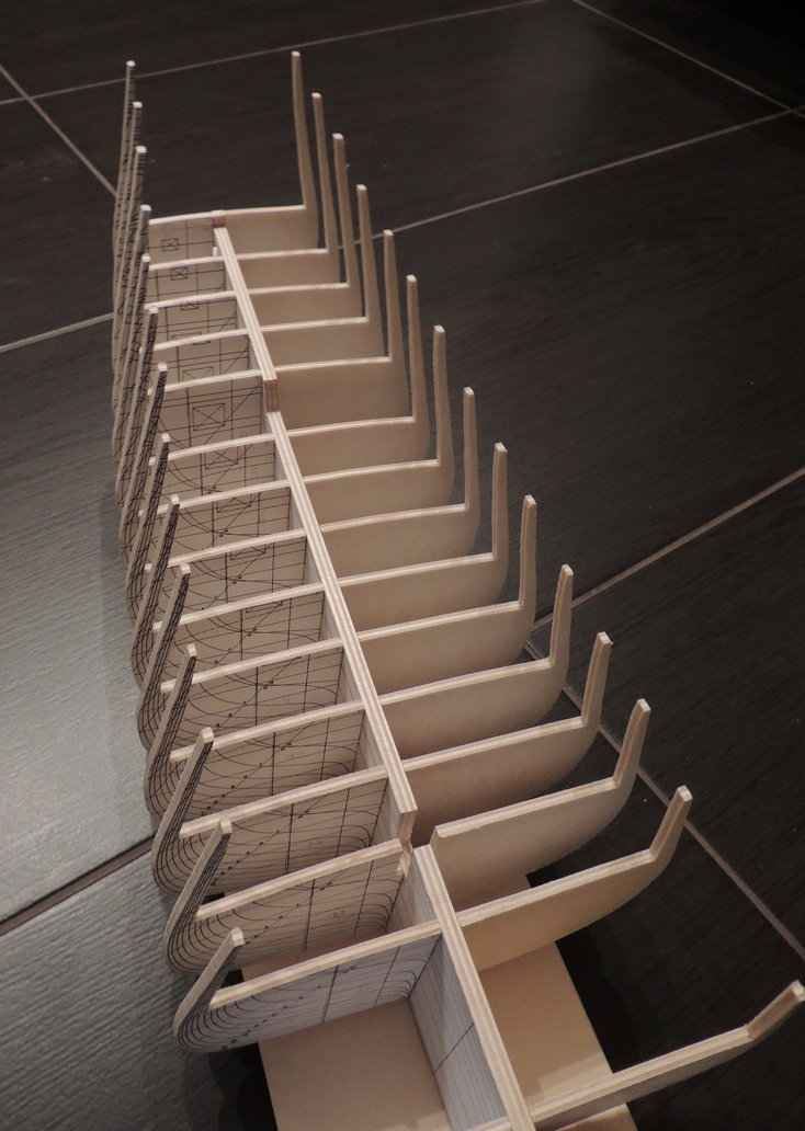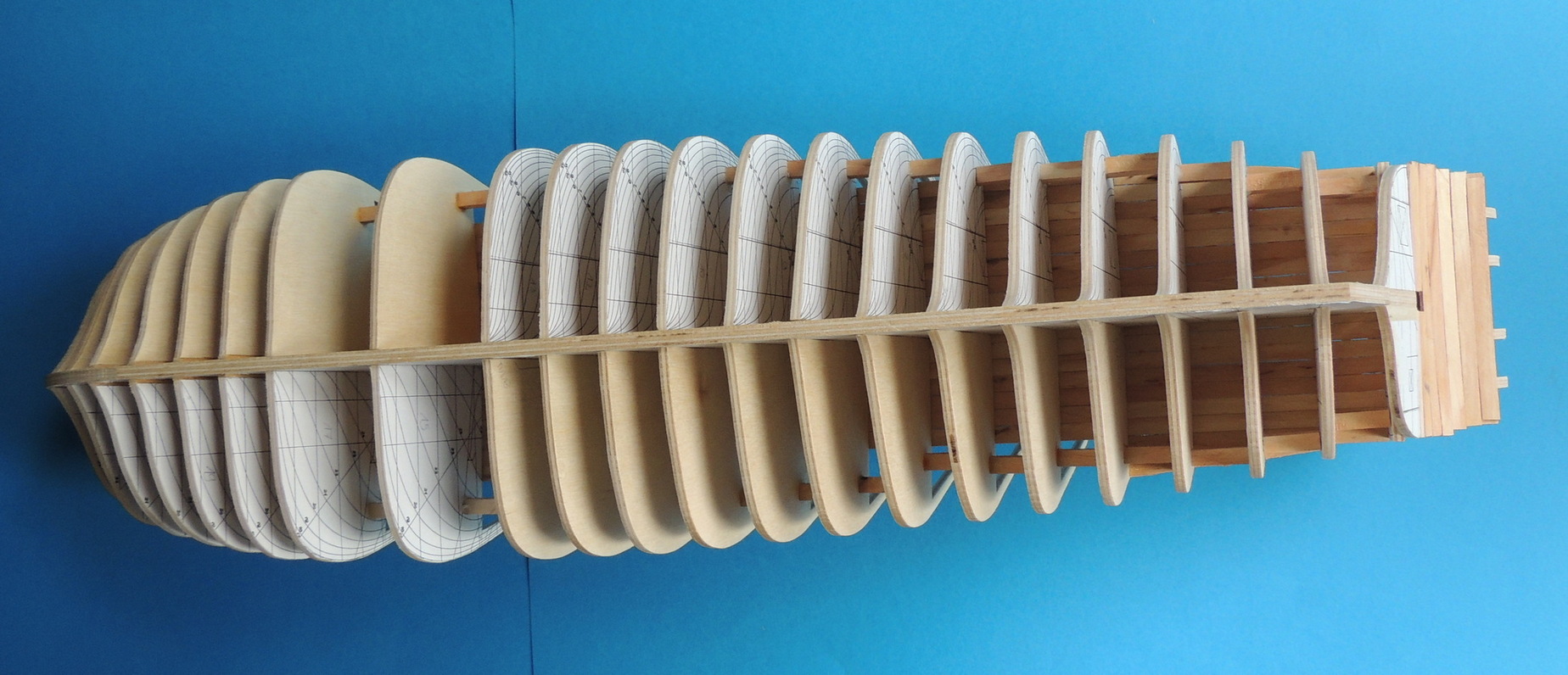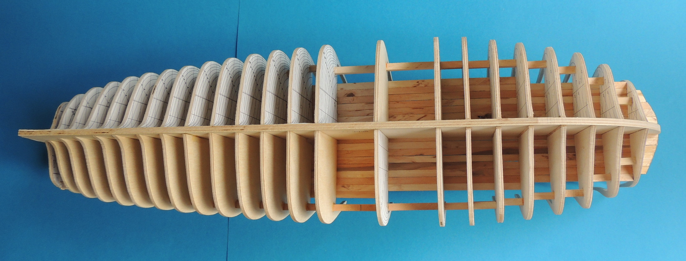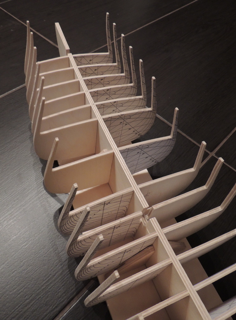 Cześć. Udało mi się dokończyć szkielet. Pomiędzy wręgi wkleiłem rozpórki, dzięki czemu szkielet jest stabilny.Teraz jestem na etapie wyklejania pierwszych fałszywych pokładów. Na razie wygląda to mało estetycznie