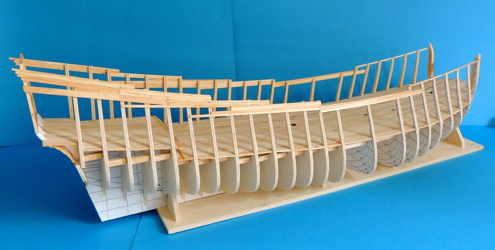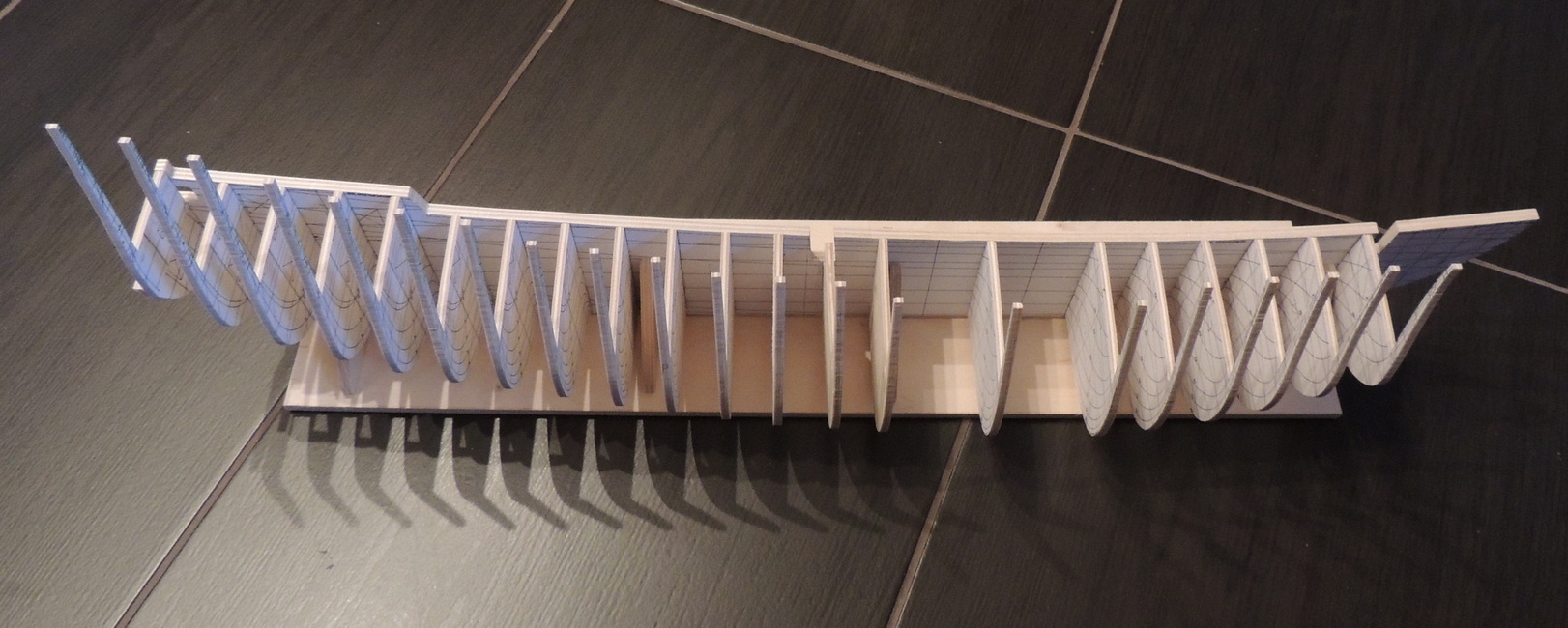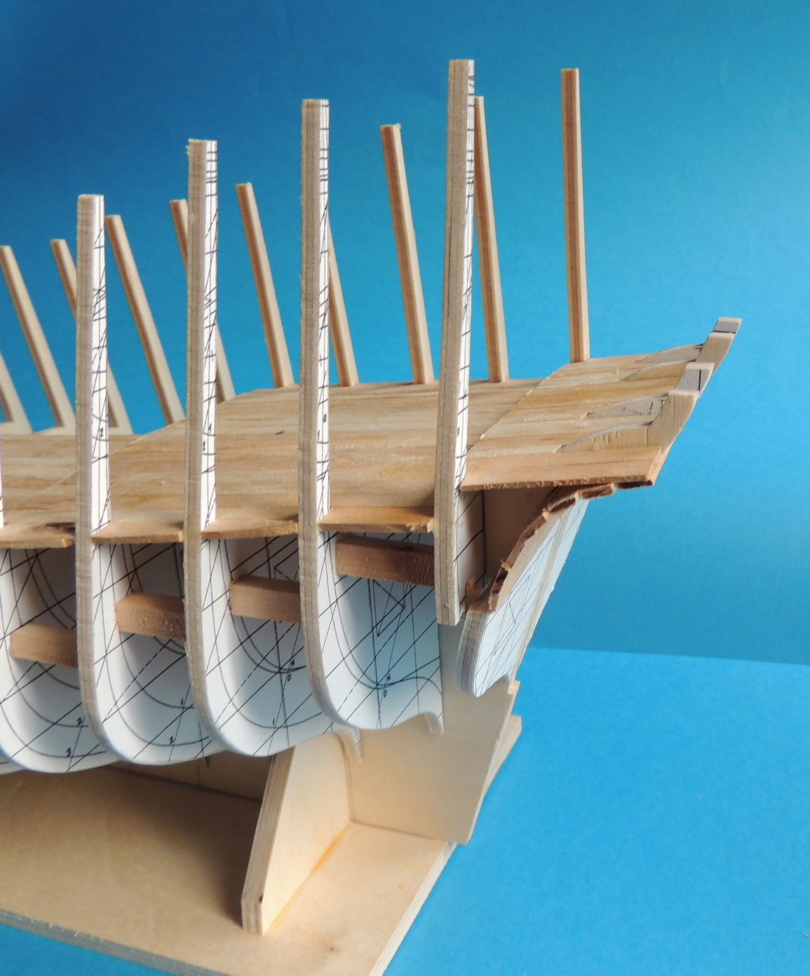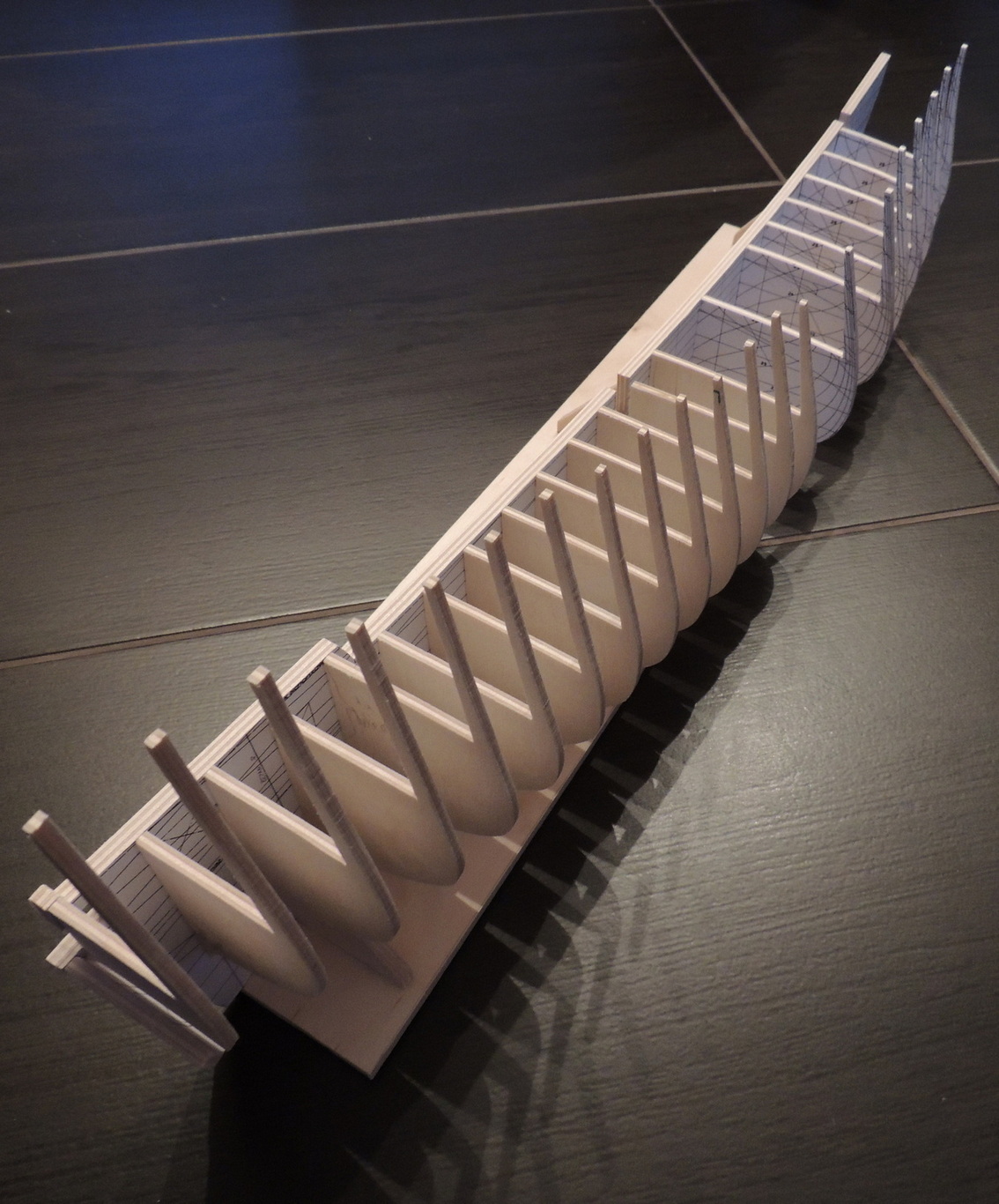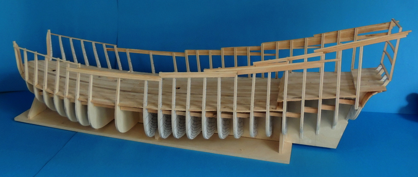 Cześć. Udało mi się dokończyć szkielet. Pomiędzy wręgi wkleiłem rozpórki, dzięki czemu szkielet jest stabilny.Teraz jestem na etapie wyklejania pierwszych fałszywych pokładów. Na razie wygląda to mało estetycznie