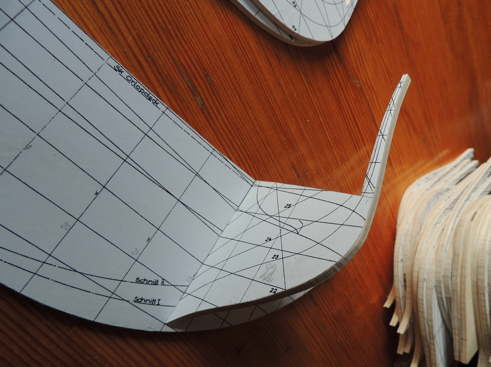 Buduję według planów Hermana Kettinga w skali 1:100 powiększonych o 30 %. Szkielet już prawie gotowy. Brakuje jeszcze wręg dziobowych i konstrukcji rufy.Wręgi odchudziłem, aby można było położyć dwie warstwy poszycia.No i tak to na razie wygląda