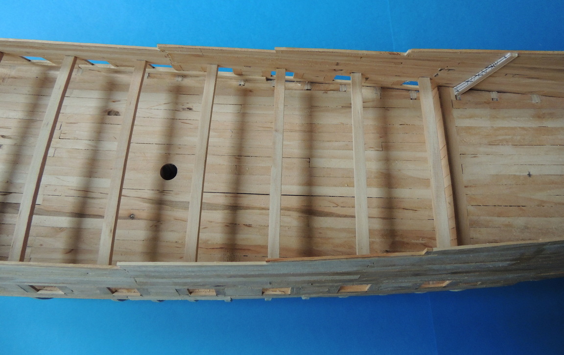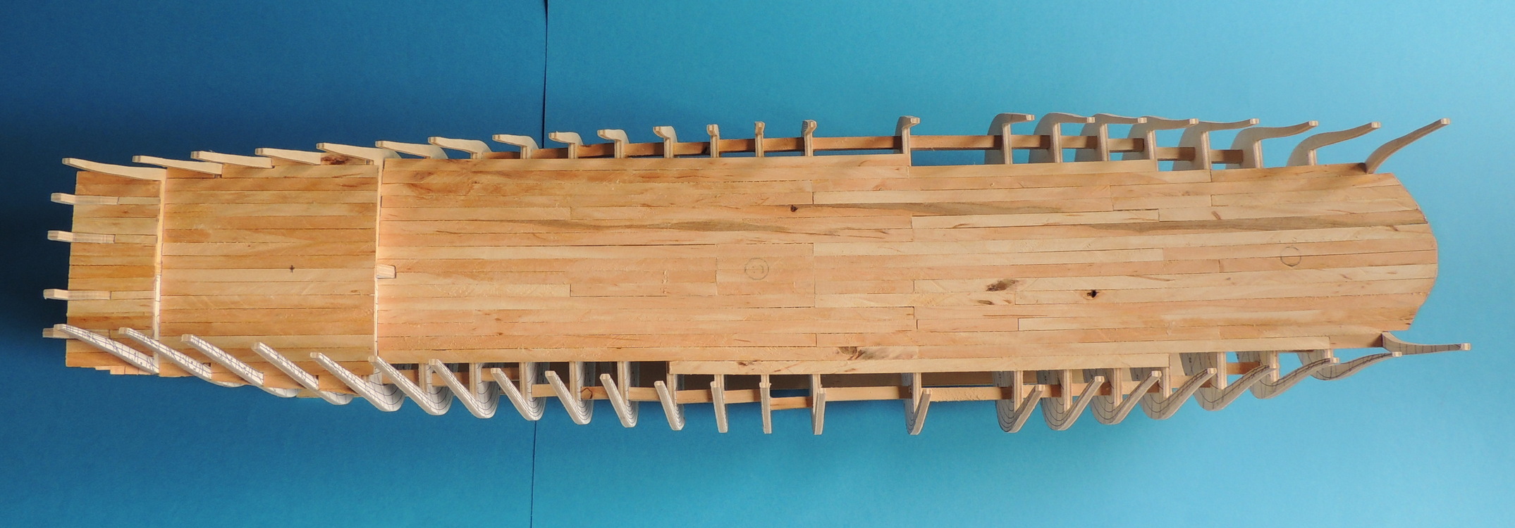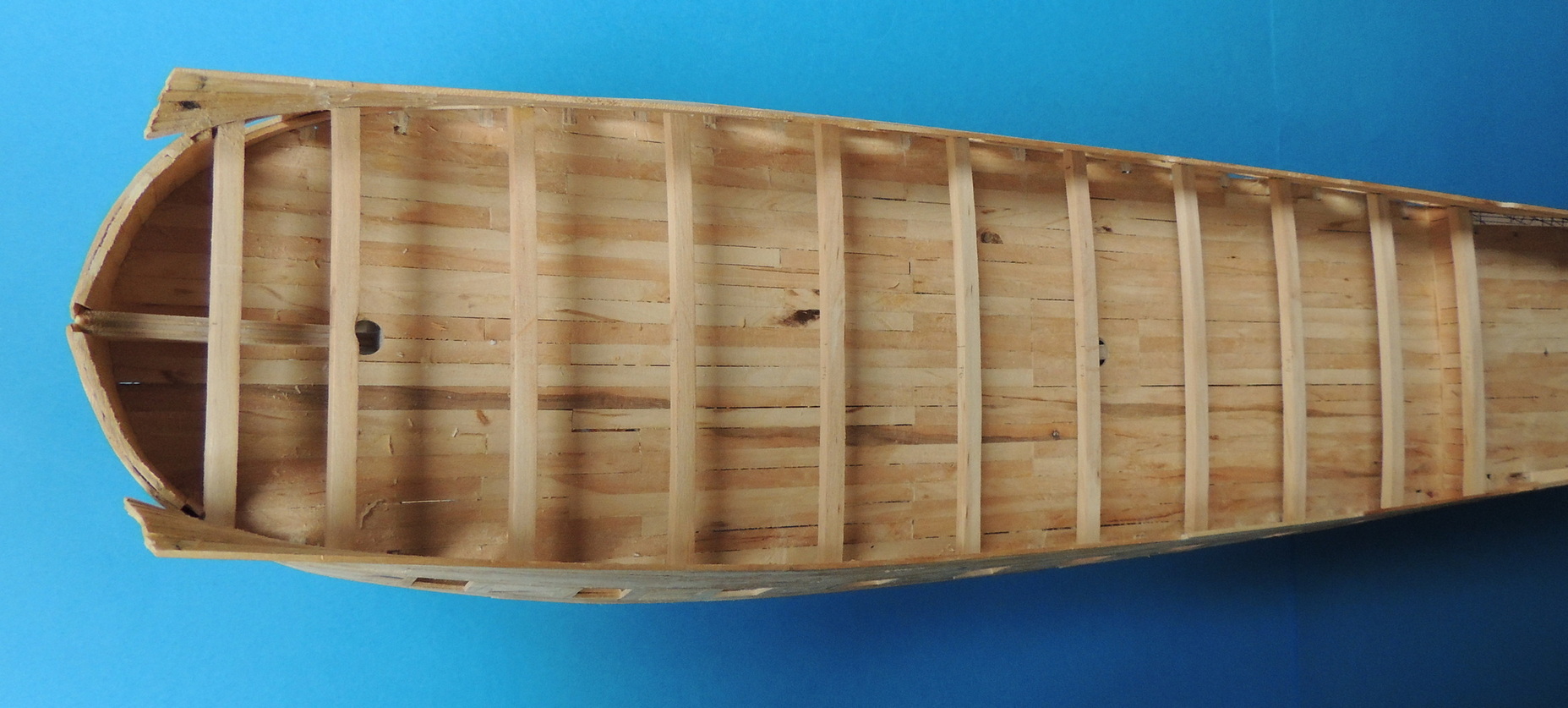 Cześć. Powoli przybywa poszycia.Zacząłem wklejać też pokładniki pod górny pokład, a jednocześnie odcinam końcówki wręg.Taka konstrukcja jest dość sztywna i nie odkształca się. Od środka widać też, pierwsze listewki drugiej warstwy poszycia.