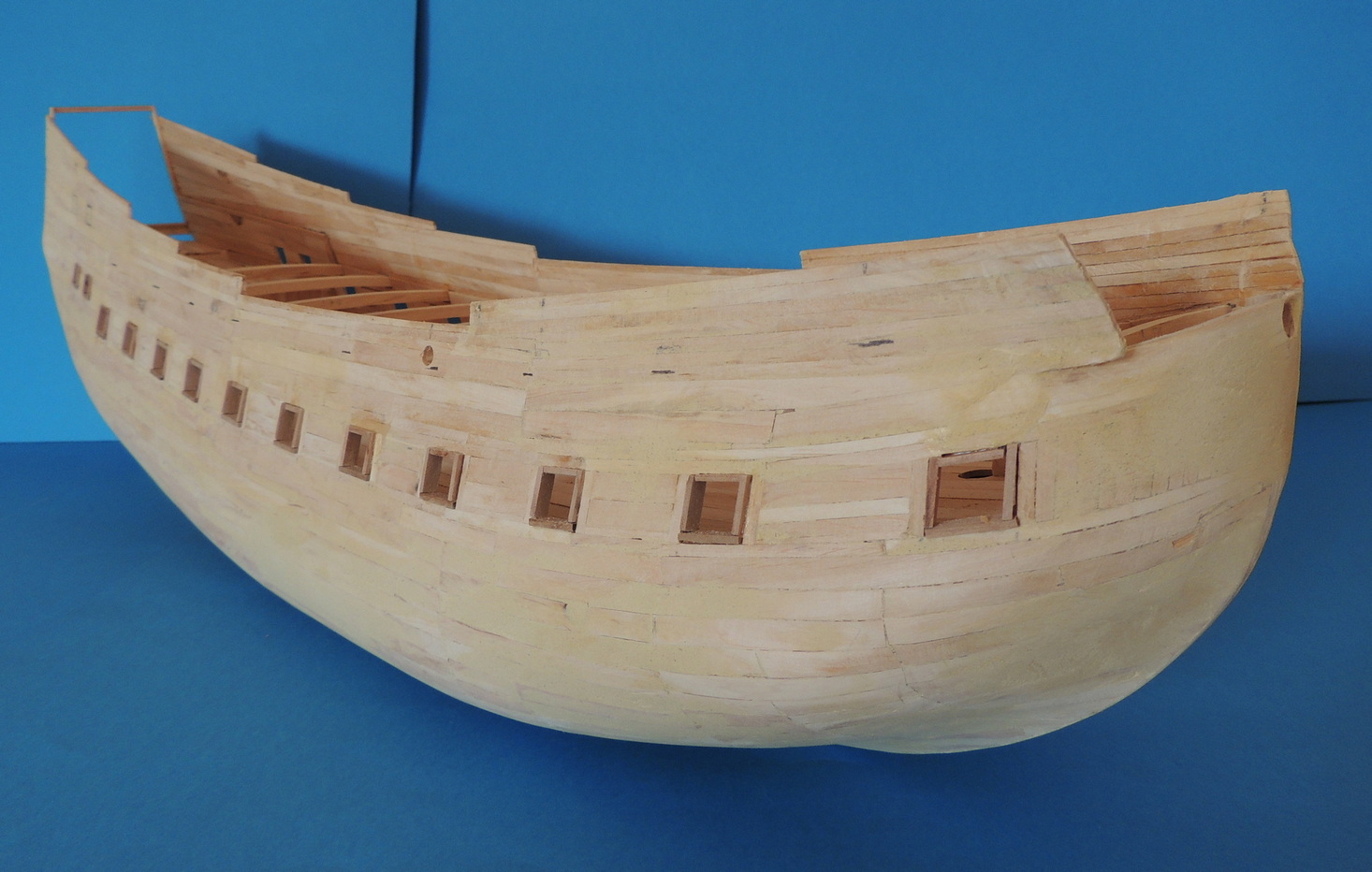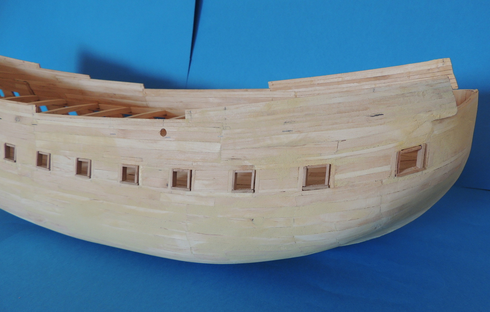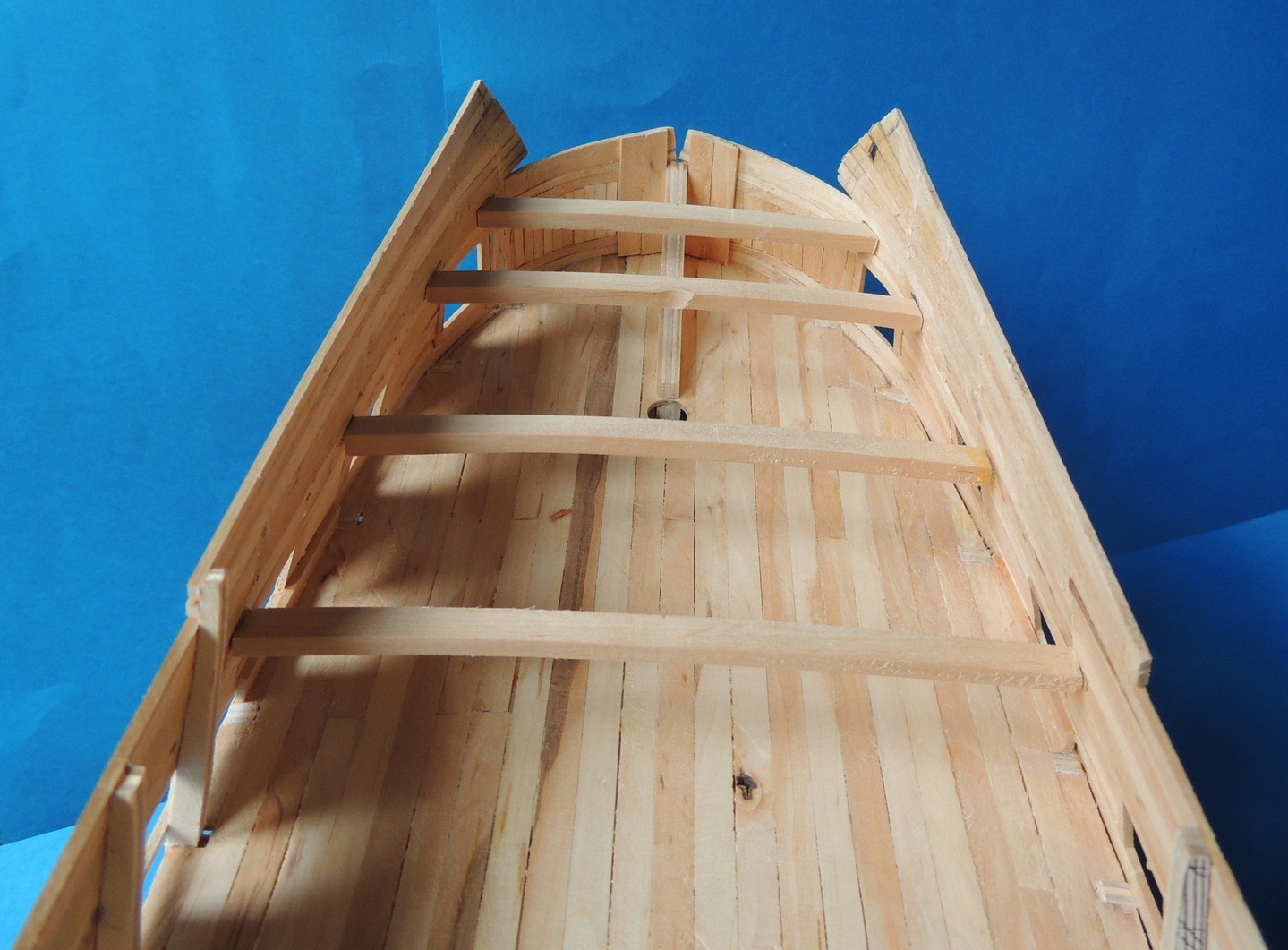 Cześć. Powoli przybywa poszycia.Zacząłem wklejać też pokładniki pod górny pokład, a jednocześnie odcinam końcówki wręg.Taka konstrukcja jest dość sztywna i nie odkształca się. Od środka widać też, pierwsze listewki drugiej warstwy poszycia.