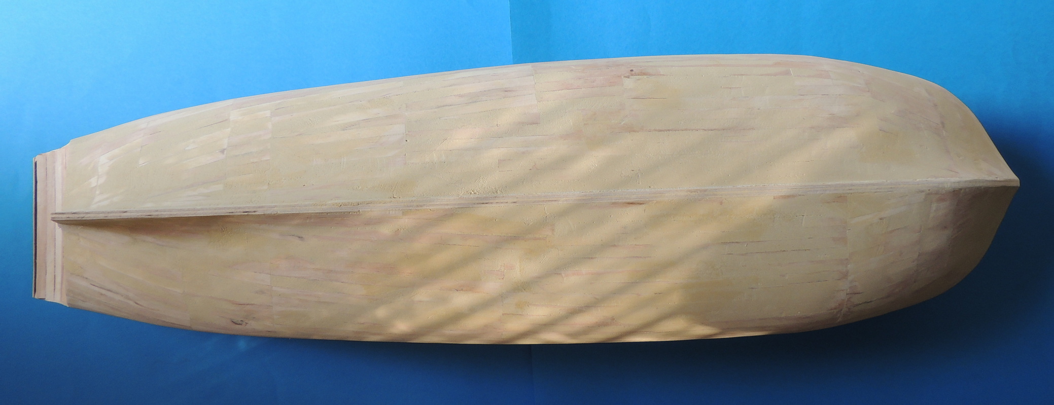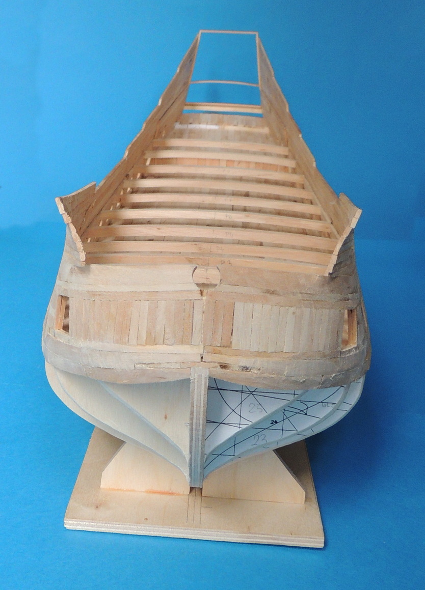 Cześć. Powoli przybywa poszycia.Zacząłem wklejać też pokładniki pod górny pokład, a jednocześnie odcinam końcówki wręg.Taka konstrukcja jest dość sztywna i nie odkształca się. Od środka widać też, pierwsze listewki drugiej warstwy poszycia.