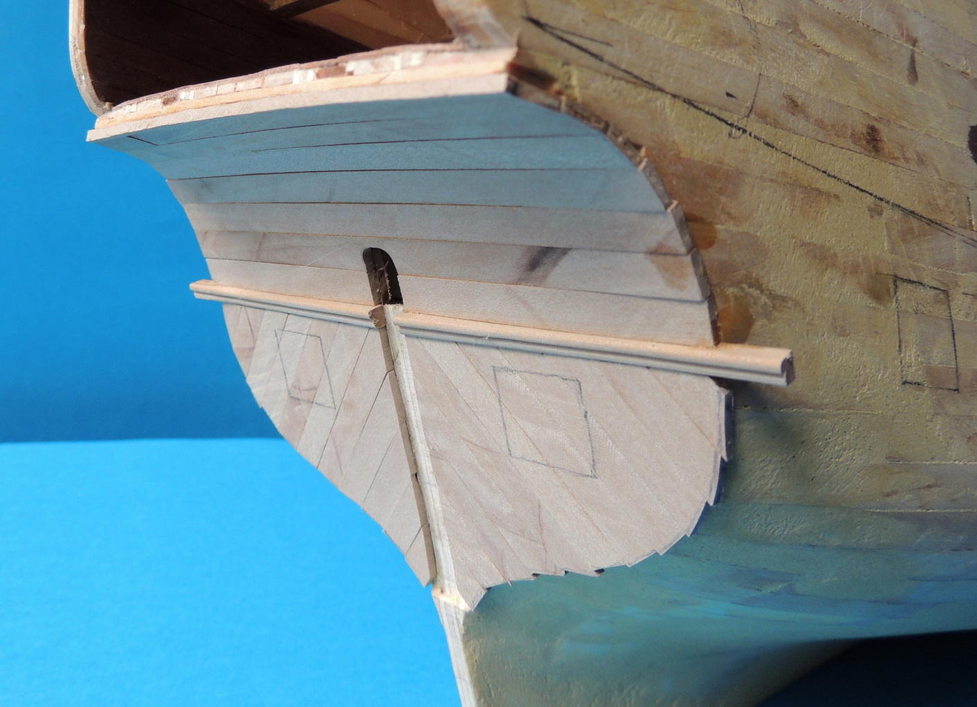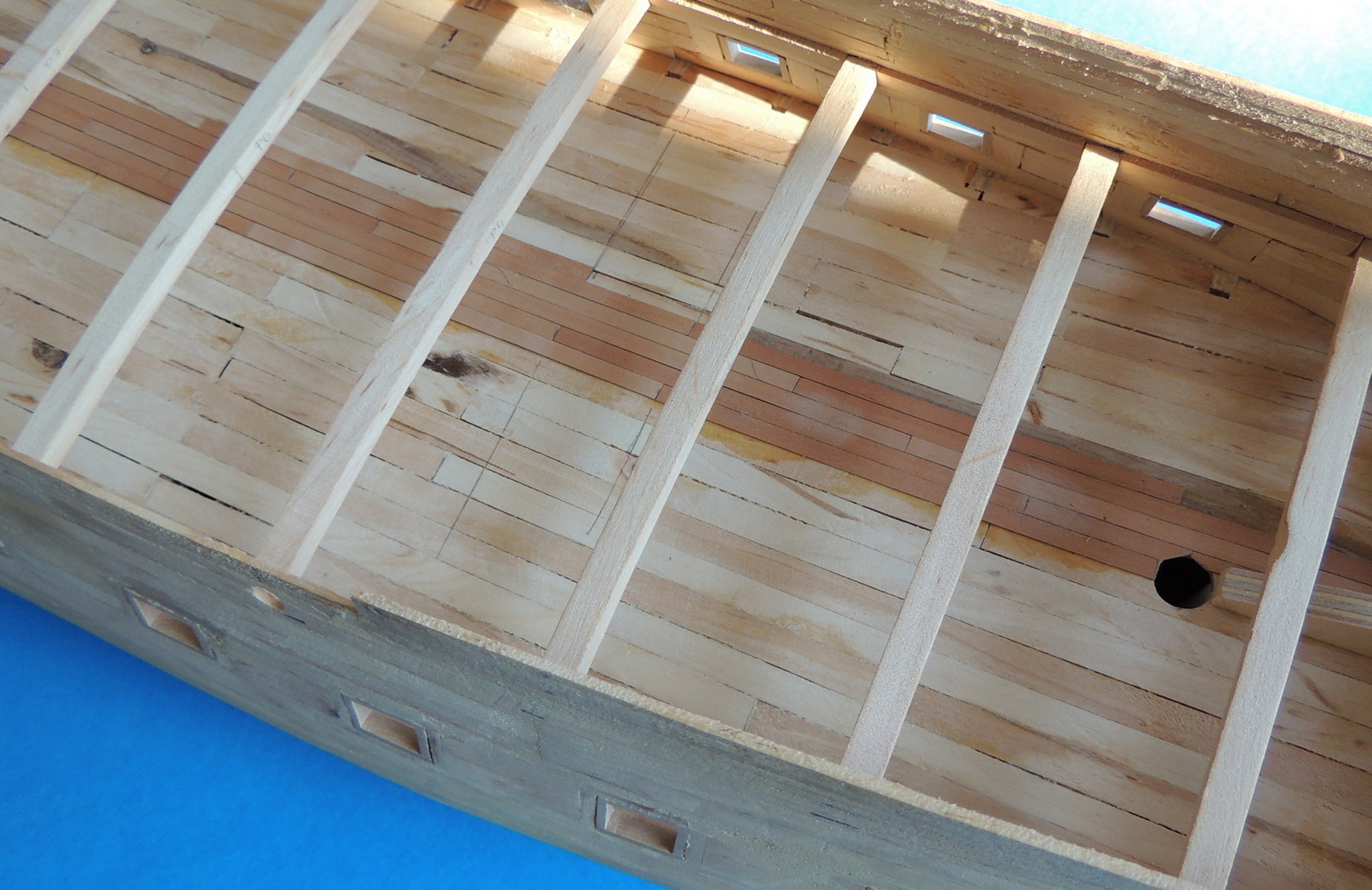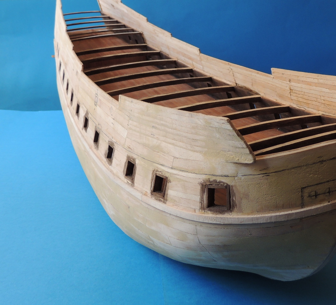 Nie jestem pewien czy to nie jest złudzenie ale w części dziobowej masz skośne otwory pod furty .Otwory są zawsze prostokątne i takie widziałem .Otwór może przecinać boczne belki .Sprawdź zanim poszyjesz.R