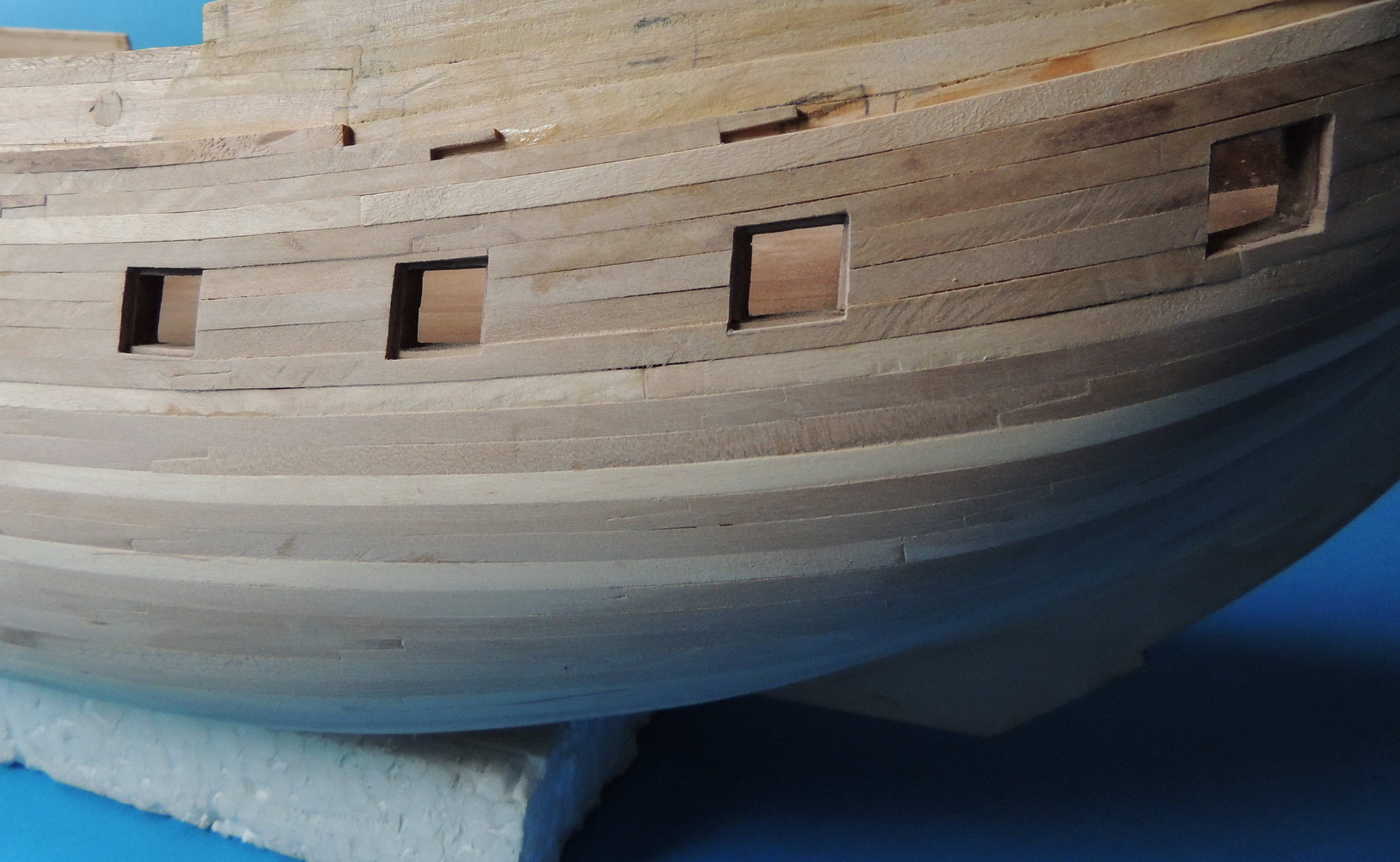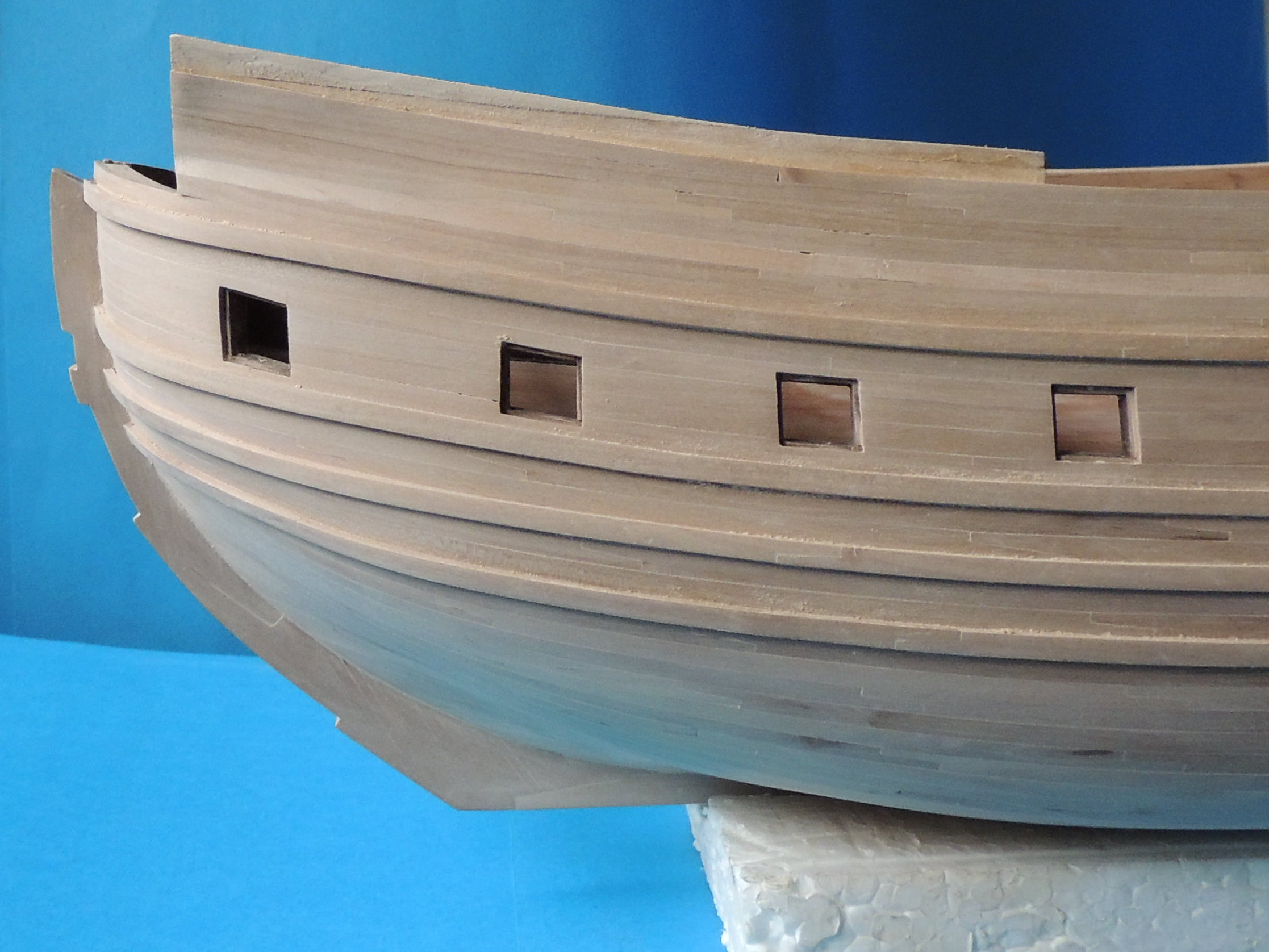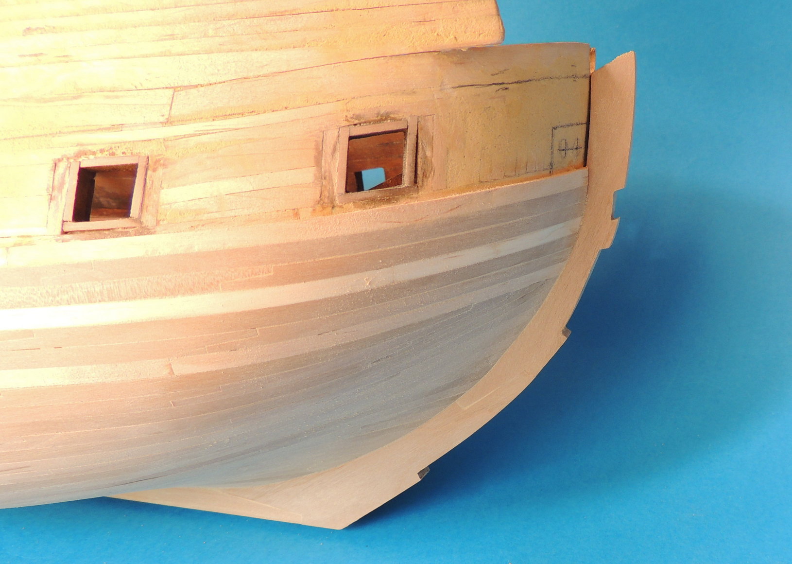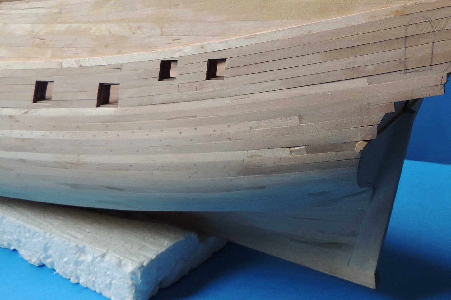 Poszycie ułożone i wyszlifowane. Jestem na etapie klejenia odbojnic. Ołówkiem narysowałem jaki mniej więcej, będzie układ gwoździ na kadłubie. Górne ambrazury będę wycinał później.
