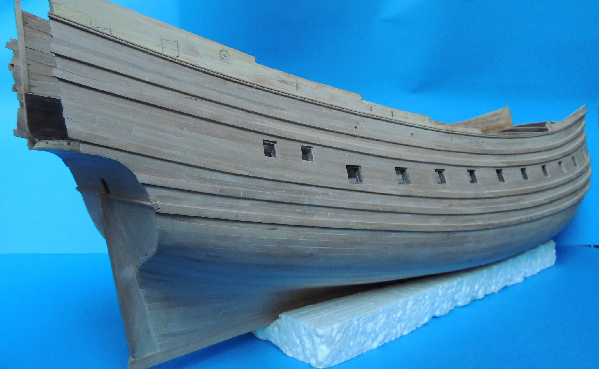 Odbojnice przyklejone. Wywierciłem otwory pod kluzy kotwiczne, i wstępne otwory ambrazur górnego pokładu. Jako że model nabrał już kształtów, zacząłem strugać dla niego podstawkę z prawdziwego zdarzenia