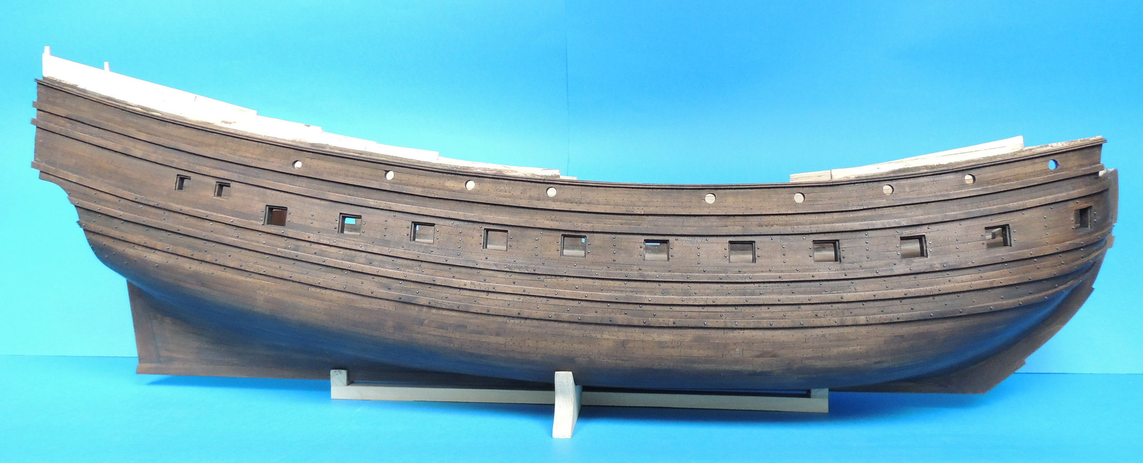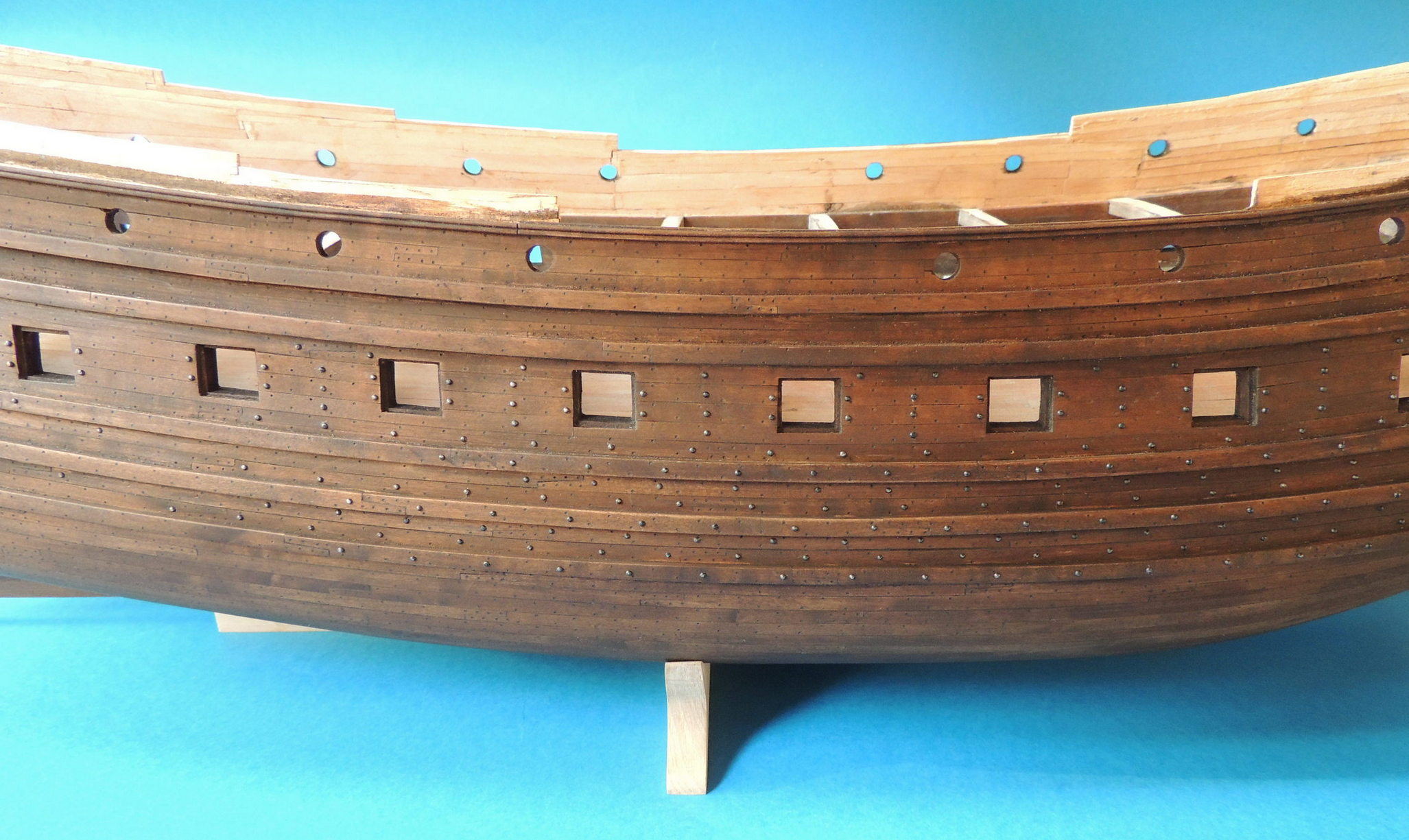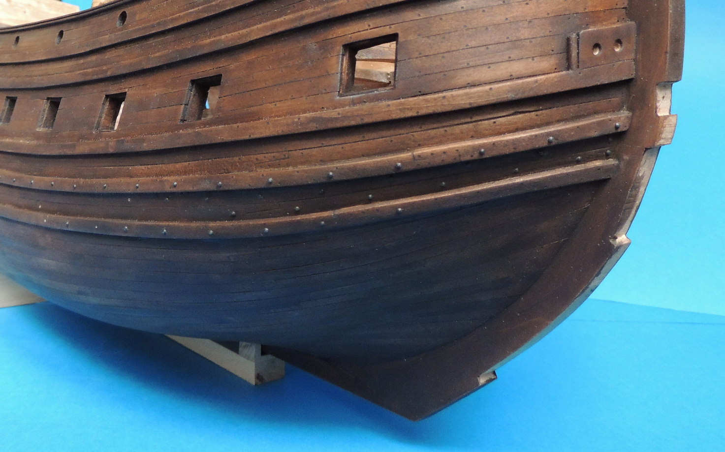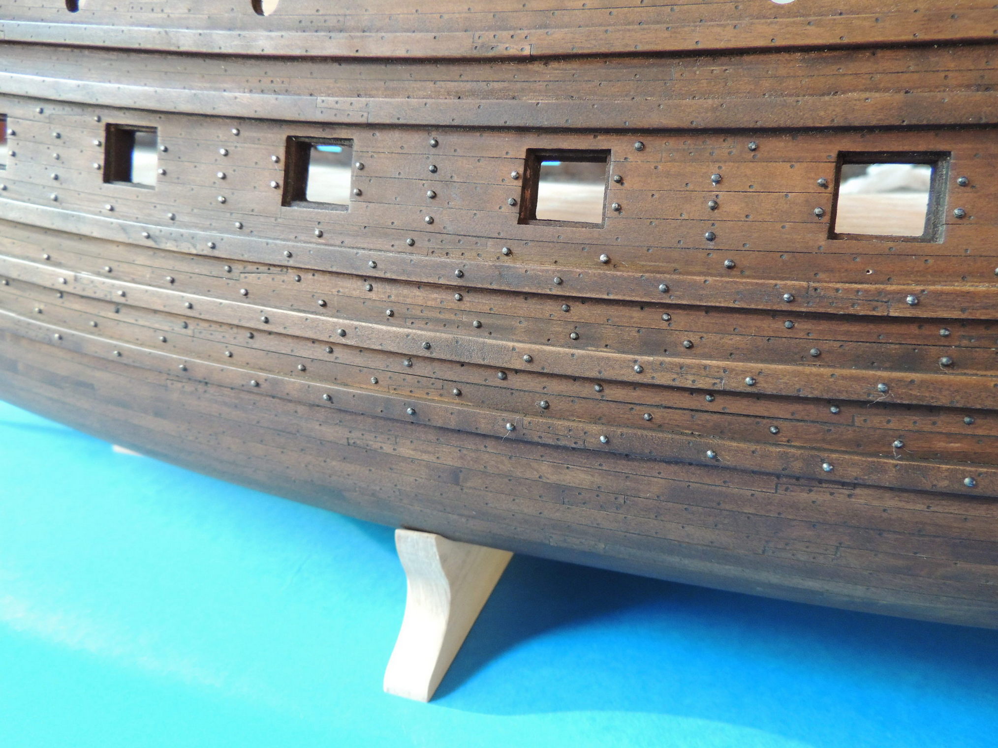 Jedna burta gotowa. Nad drugą jeszcze pracuję. Z historycznego modelu wynika, że gwoździe nie były bite w całą burtę. Był to mniej więcej równoległy do linii wodnej, szeroki pas.