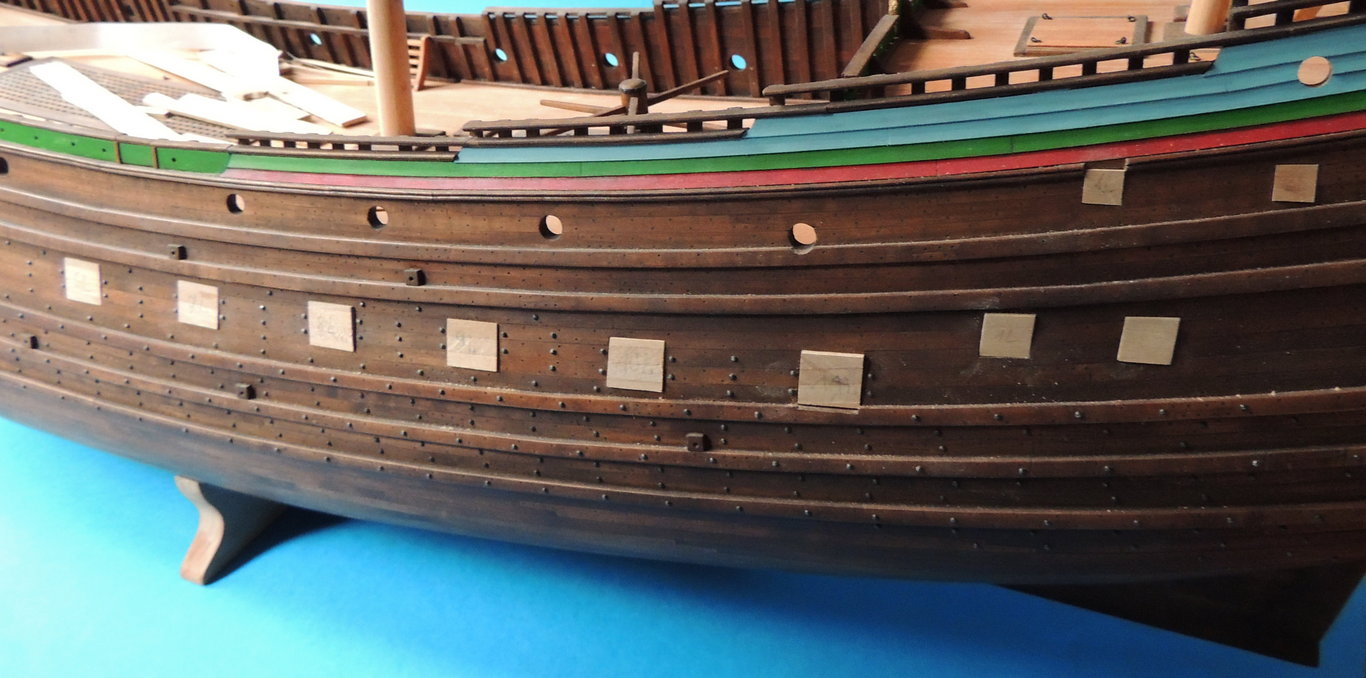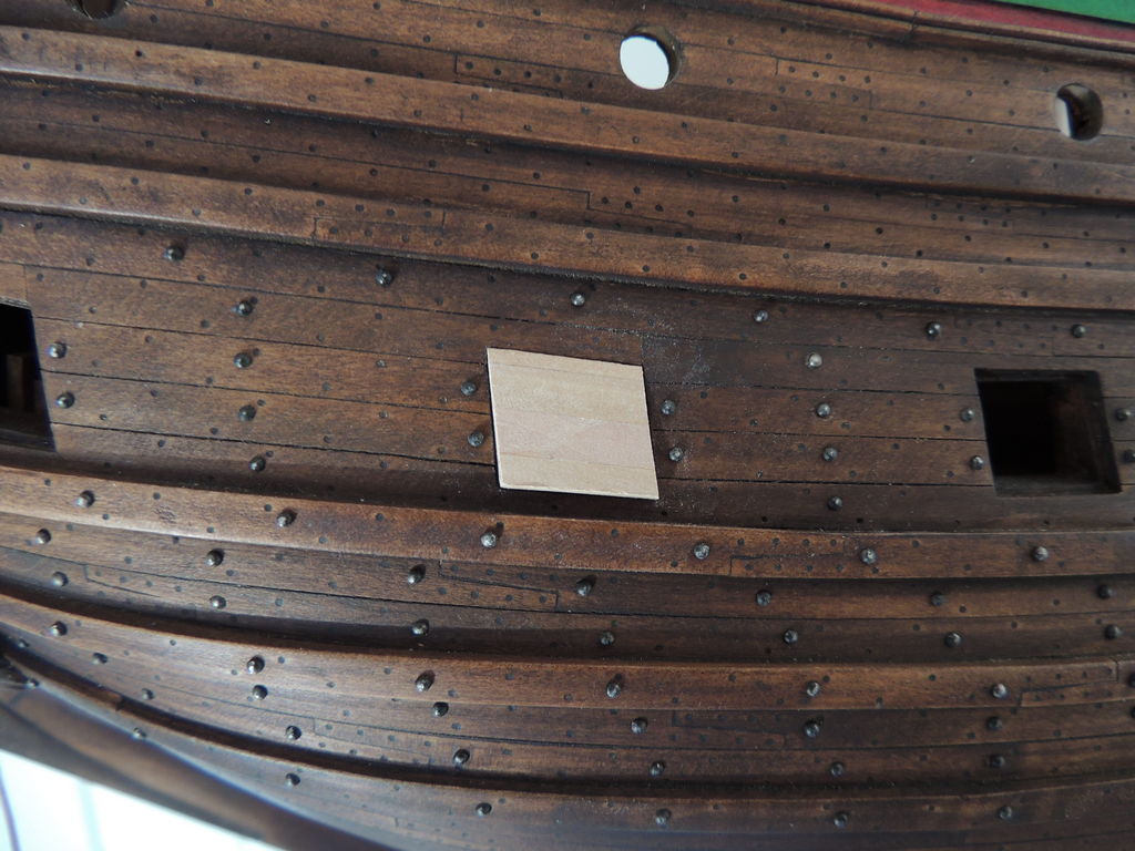 Zabrałem sie za pokrywy ambrazur, chociaż przy dziobie, zostało jeszcze trochę roboty. Zastanawiam się jak wykonać zawiasy. Czy wykonać po prostu nieruchome atrapy, czy pomęczyć się z ruchomymi ? Czy lepiej będzie kupić rurki mosiężne np. fi 1mm i do tego cienka blaszka i drut, czy może lepiej powywijać z blaszki? Hmm...
