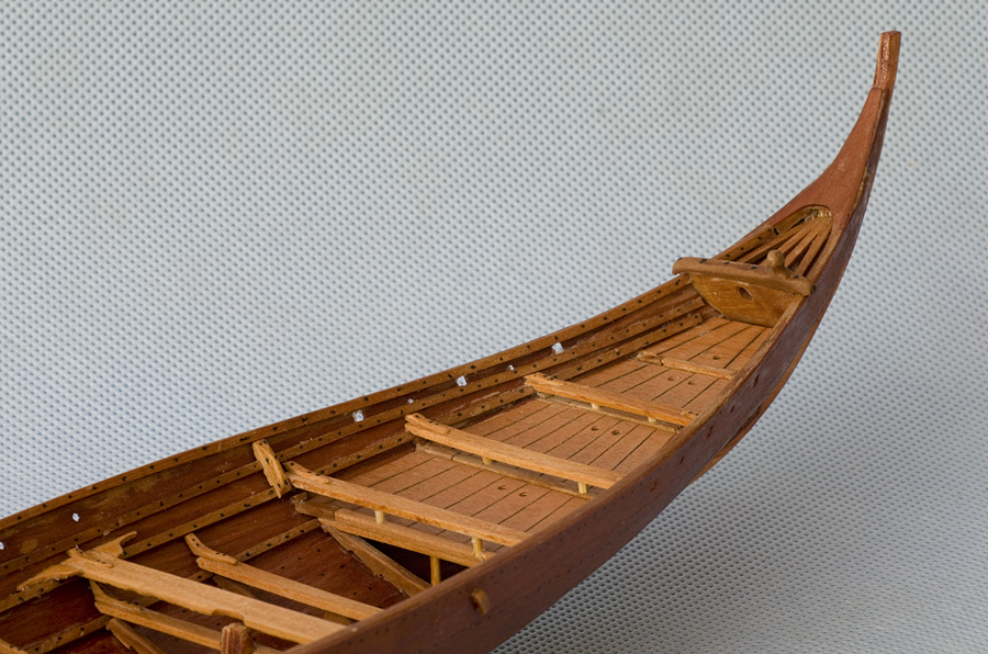 Kolega pytał o imitację kołkowania. Otóż nie jest to imitacja kołkowania ale nitowania :D . Łodzie wikingów były doskonałe, ale łodzie słowian także były doskonałe. Po prostu jedne miały lepsze to, drugie tamto. I właśnie łodzie słowian biły łodzie wikingów sposobem łączenia poszycia - były kołkowane, natomiast łodzie wikingów były nitowane żelaznymi nitami, a te korodowały. Jak zrobiłem nitowanie? Ano poszycie jest z forniru 0,6 mm, co daje 1,2 mm na łączeniu. Nie ma szans (przynajmniej ja nie potrafię) nawiercić i coś wstawić - nie kołki, bo to musi imitować żelazo. Początkowo chciałem zastosować sposób RomkaS z kropelkami kleju zabarwionymi na czarno, ale niestety, mimo kombinowania i sprawdzania różnych sposobów nakładania kropelek kleju, nie udało mi się uzyskać powtarzalnego efektu, kleksy były różnej średnicy. Więc w końcu zrobiłem to najprostszym z możliwych sposobów: Faber Castel 0,2 mm i punkciki są rysowane/malowane :D