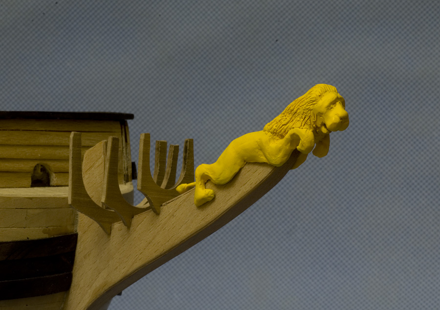 Ciąg dalszy zabawy w rzeźbiarstwo. Trochę znów kombinowałem, próbowałem, mierzyłem się z rzeźbą galionową. Znów parę prób, parę porażek aż w końcu wyszło coś, co trochę lwa przypomina. I choć Jurek Borwiński (autor planów i zestawu) na swoim wzorcowym modelu ( przy opisie zestawu w Modelarzu 11/2009) zrobił lwa złotego, to ja jednak stwierdziłem, że skoro to ma być Żółty Lew, to ja go popsikam na żółto. i tak to wyszło: