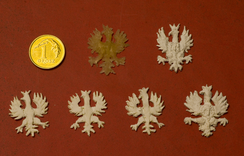 Trochę czasu poświęciłem na wytworzenie orzełka na pawęż. Nie udało mi się znaleźć odpowiedniego orzełka zygmuntowskiego, z którego mógłbym odcisnąć formę do odlewu, więc zacząłem zabawę w samodzielne rzeźbienie ptaszka. Po wielokrotnej dłubaninie w modelinie uznałem, że lepiej już nie zrobię i jeden wybrany "okaz" został potraktowany ciut złotolem i docelowo trafi na pawęż.