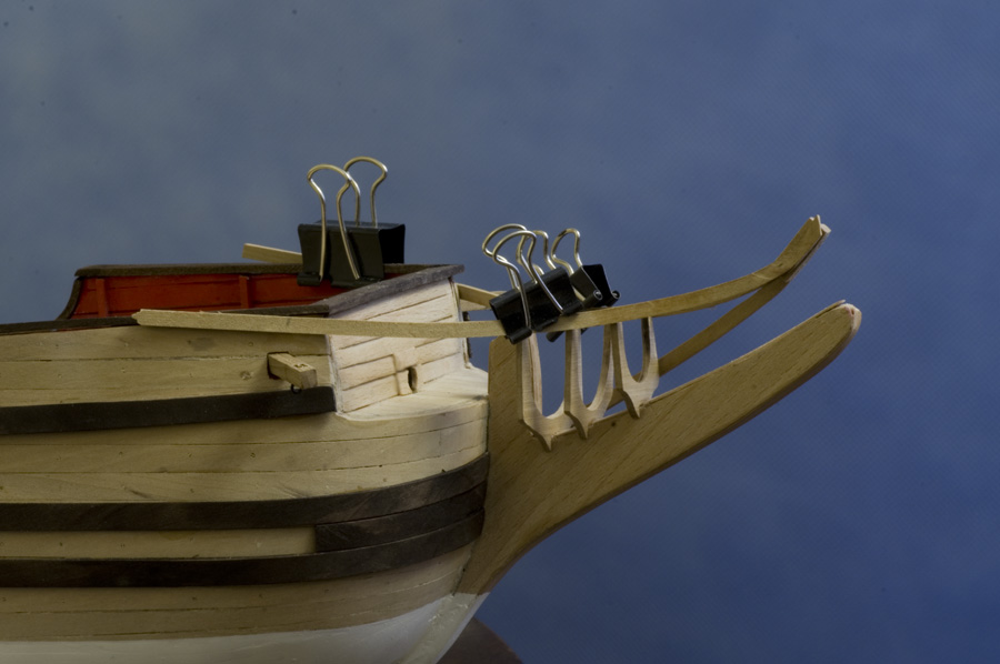 Długo trwała zabawa z klejeniem kosza dziobowego. W sumie dopiero trzecia wersja kosza jako tako mnie zadowoliła i ostatecznie znalazła się na modelu.