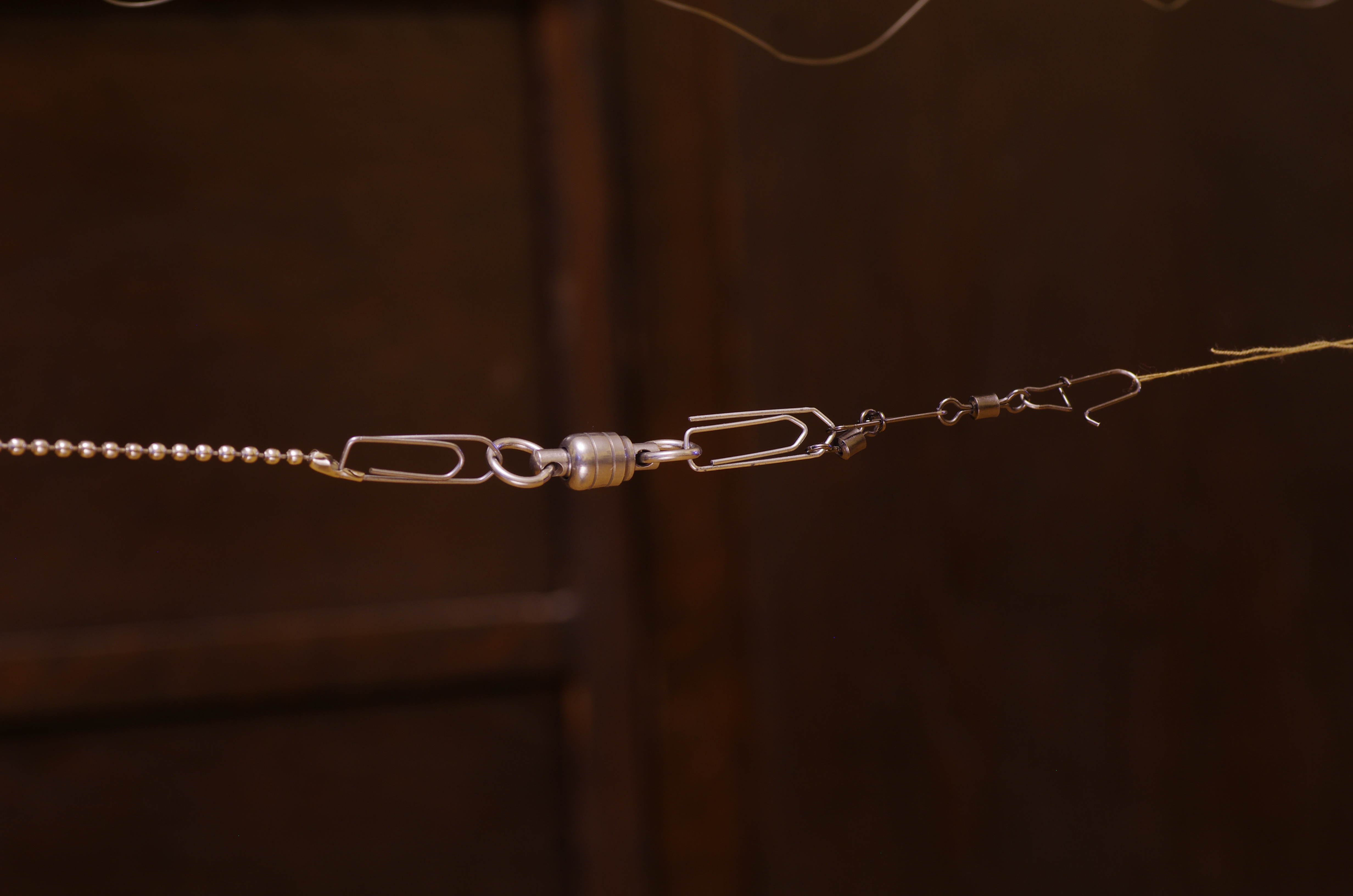 Początkowo jako krętlik stosowałem łańcuszek z ruchomymi kulkami… efekt słaby, musiałem często inicjować skręcanie przez popychanie „samolocika” czy inne kombinacje.