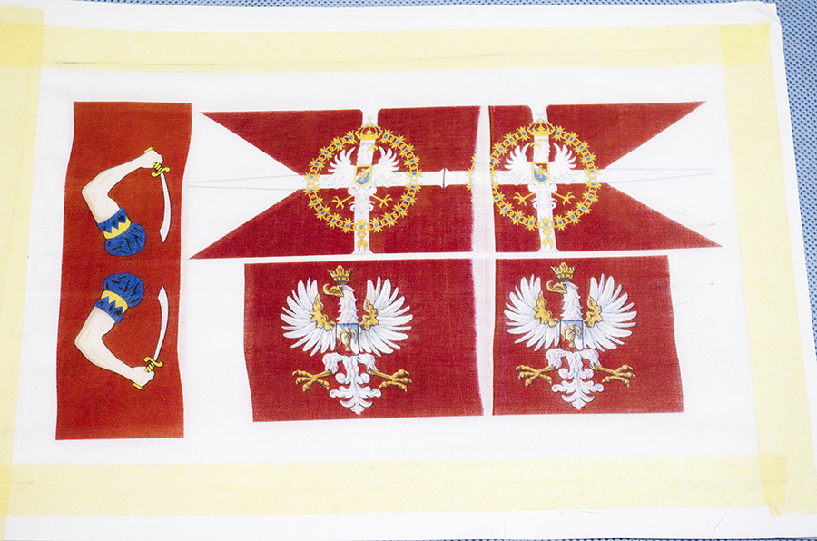 Kotwice gotowe do podwieszenia, czas na wywieszenie bandery. Jako, że bandery na Żółtym Lwie mają dość skomplikowany wzór i pędzelkowanie byłoby okrutnie trudne, wymyśliłem, że se flagi wydrukuje.