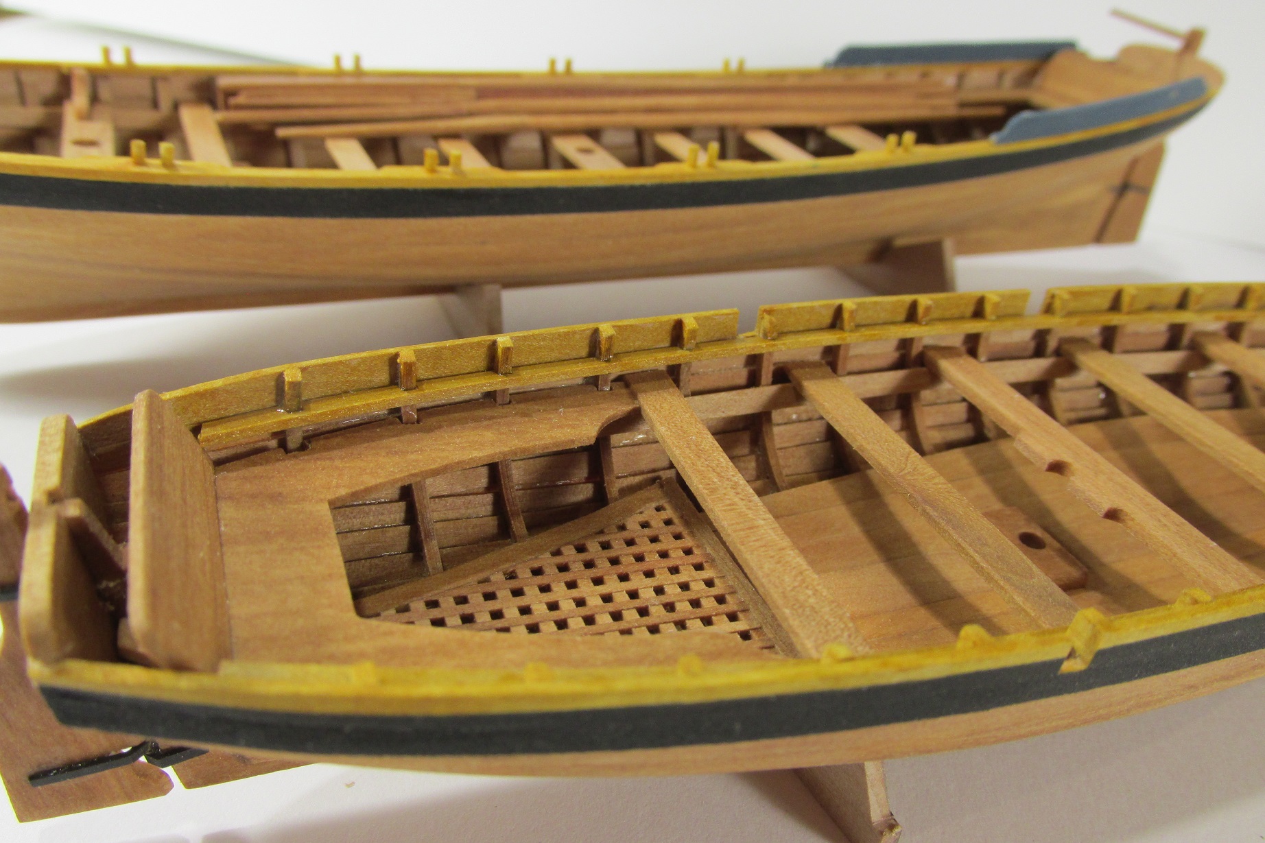 Pracuję teraz nad drugą szalupą. Pierwsza już gotowa. Tę drugą robię innym sposobem, wręgi wycinam nie wyginam i poszycie będzie klinkierowe. Jak kilkukrotnie podpowiadał Tomek, do tego rodzaju poszycia najlepiej przygotować plankę z frezem, tak też zamierzam robić.