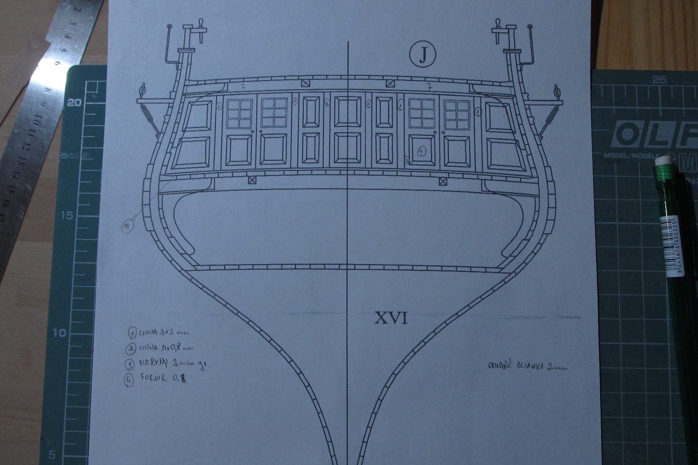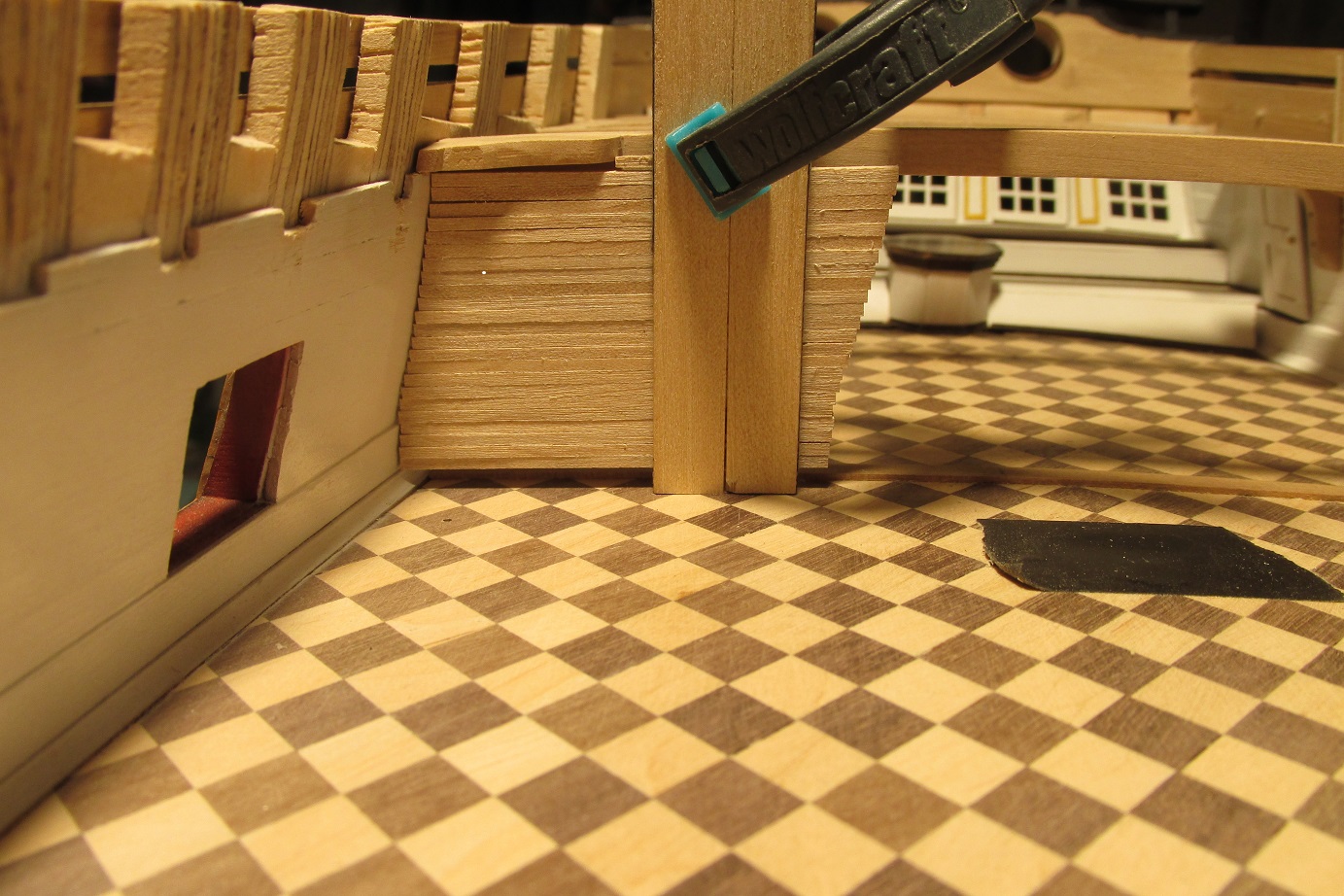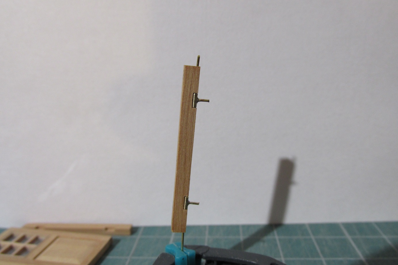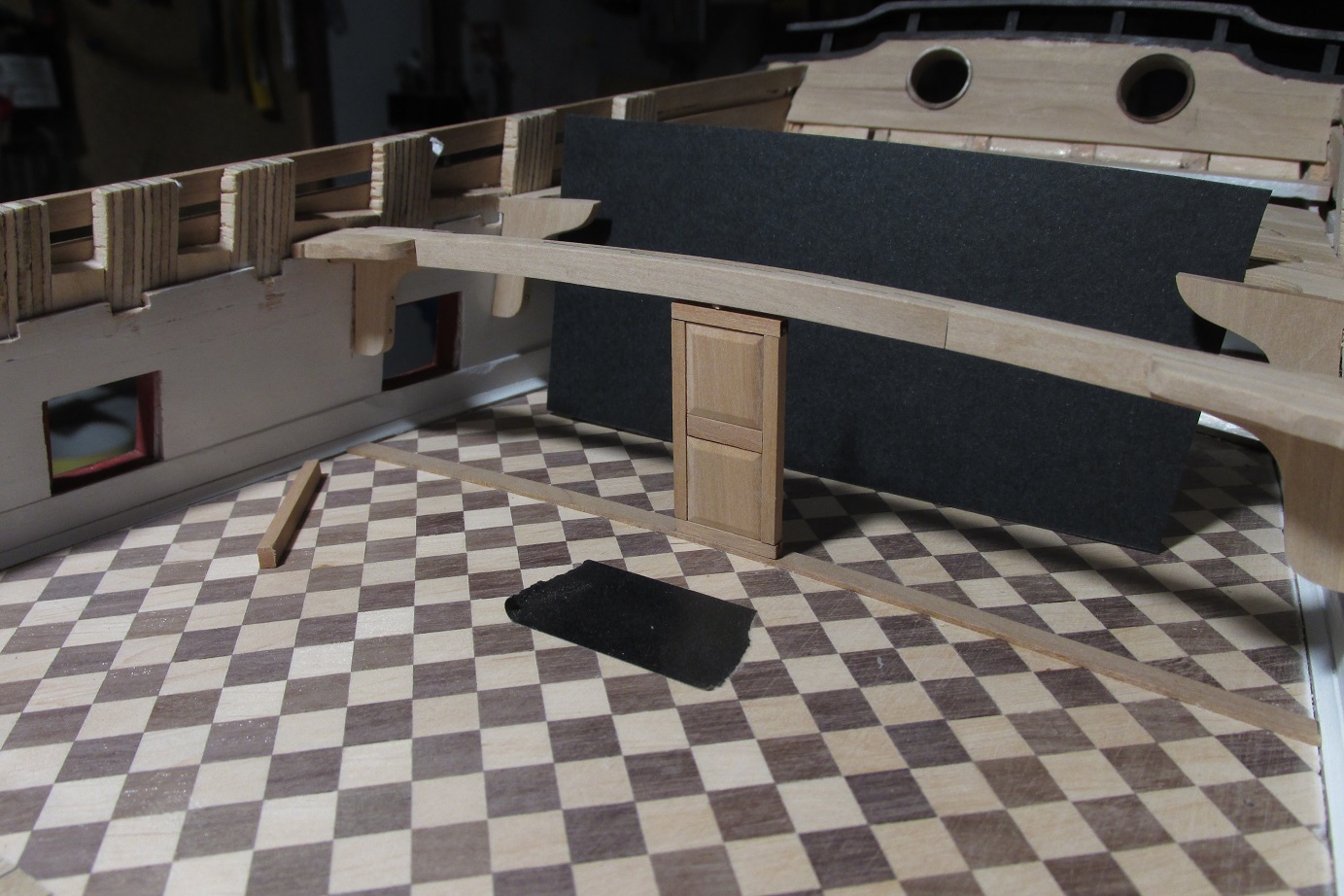 Dalej ciągnę ściankę pod quarter deckiem, ponieważ tokarka wróciła już z serwisu, to mogłem wytoczyć zawiasy do drzwi i je zamontować.